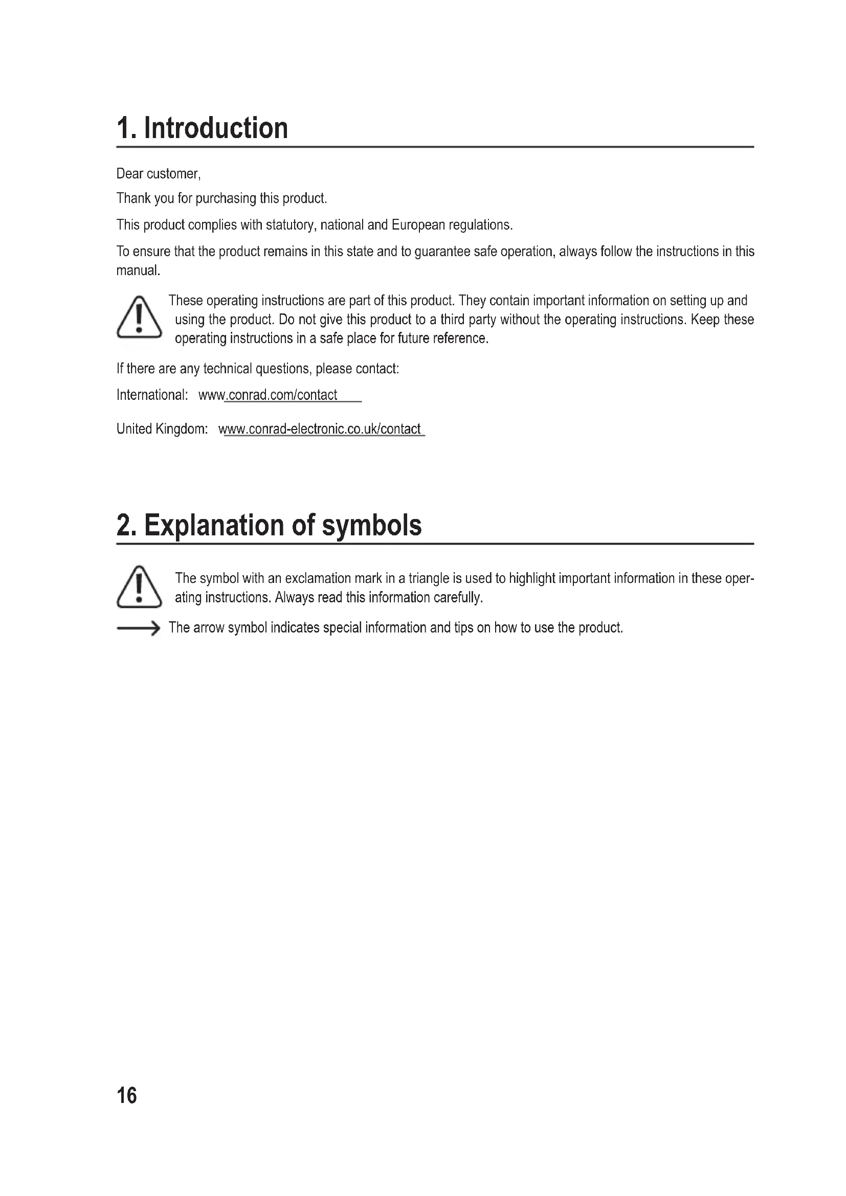 Dear customer, Thank you for purchasing this product. This product complies with statutory, national and European regulations. To ensure that the product remains in this state and to guarantee safe operation, always follow the instructions in this manual. These operating instructions are part of this product. They contain important information on setting up and using the product. Do not give this product to a third party without the operating instructions. Keep these operating instructions in a safe place for future reference. If there are any technical questions, please contact: International: www.conrad.com/contact United Kingdom: www.conrad-electronic.co.uk/contact