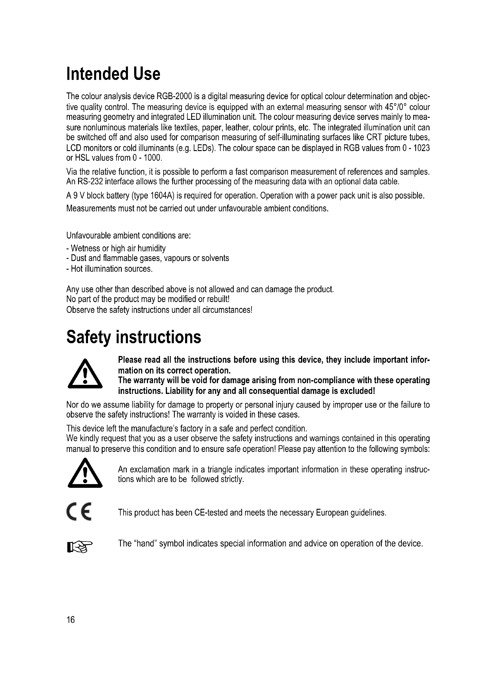- Technical Data Intended Use The colour analysis device RGB-2000 is a digital measuring device for optical colour determination and objec- tive quality control. The measuring device is equipped with an external measuring sensor with 45°/0° colour measuring geometry and integrated LED illumination unit. The colour measuring device serves mainly to mea- sure nonluminous materials like textiles, paper, leather, colour prints, etc. The integrated illumination unit can be switched off and also used for comparison measuring of self-illuminating surfaces like CRT picture tubes, LCD monitors or cold illuminants (e.g. LEDs). The colour space can be displayed in RGB values from 0 - 1023 or HSL values from 0 - 1000. Via the relative function, it is possible to perform a fast comparison measurement of references and samples. An RS-232 interface allows the further processing of the measuring data with an optional data cable. A 9 V block battery (type 1604A) is required for operation. Operation with a power pack unit is also possible. Measurements must not be carried out under unfavourable ambient conditions. Unfavourable ambient conditions are: - Wetness or high air humidity - Dust and flammable gases, vapours or solvents - Hot illumination sources. Any use other than described above is not allowed and can damage the product. No part of the product may be modified or rebuilt! Observe the safety instructions under all circumstances! Safety instructions Please read all the instructions before using this device, they include important infor- mation on its correct operation. The warranty will be void for damage arising from non-compliance with these operating instructions. Liability for any and all consequential damage is excluded! Nor do we assume liability for damage to property or personal injury caused by improper use or the failure to observe the safety instructions! The warranty is voided in these cases. This device left the manufacture’s factory in a safe and perfect condition. We kindly request that you as a user observe the safety instructions and warnings contained in this operating manual to preserve this condition and to ensure safe operation! Please pay attention to the following symbols: An exclamation mark in a triangle indicates important information in these operating instruc- tions which are to be followed strictly. This product has been CE-tested and meets the necessary European guidelines. The “hand” symbol indicates special information and advice on operation of the device. p. 2516