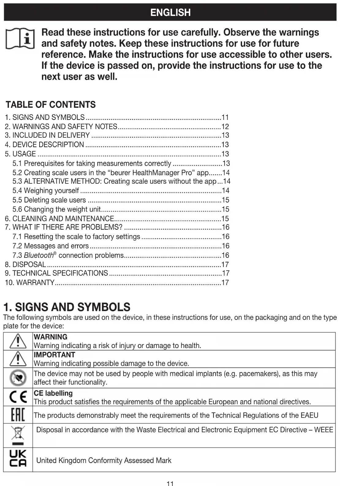 The following symbols are used on the device, in these instructions for use, on the packaging and on the type plate for the device: WARNING Warning indicating a risk of injury or damage to health. IMPORTANT Warning indicating possible damage to the device. The device may not be used by people with medical implants (e.g. pacemakers), as this may aect their functionality. CE labelling This product satisfies the requirements of the applicable European and national directives. The products demonstrably meet the requirements of the Technical Regulations of the EAEU Disposal in accordance with the Waste Electrical and Electronic Equipment EC Directive – WEEE United Kingdom Conformity Assessed Mark12 Manufacturer