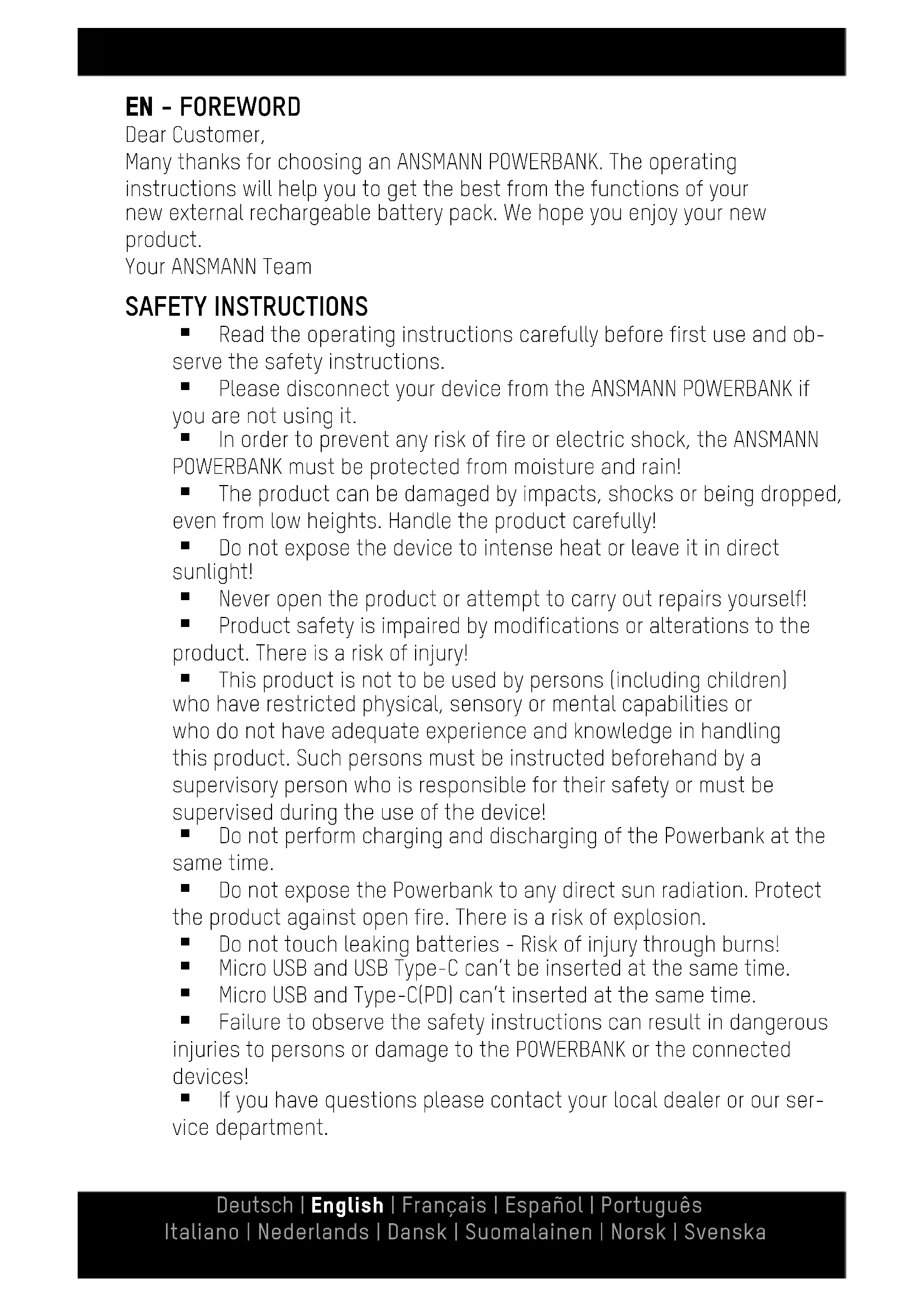Many thanks for choosing an ANSMANN POWERBANK. The operating instructions will help you to get the best from the functions of your new external rechargeable battery pack. We hope you enjoy your new product.