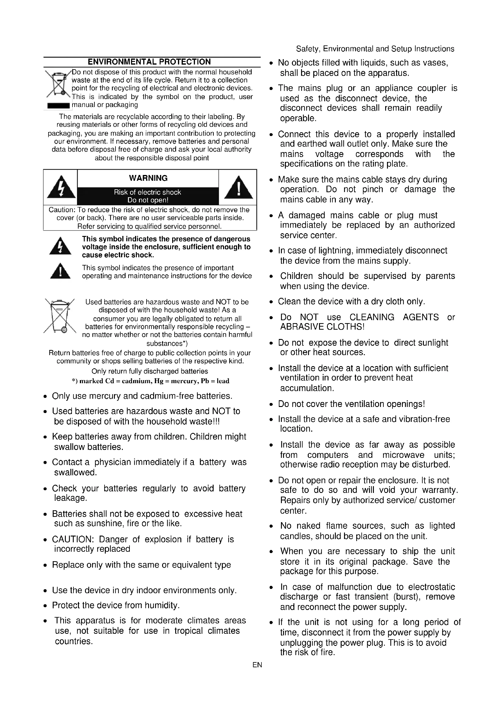 Do not dispose of this product with the normal household waste at the end of its life cycle. Return it to a collection point for the recycling of electrical and electronic devices. This is indicated by the symbol on the product, user manual or packaging The materials are recyclable according to their labeling. By reusing materials or other forms of recycling old devices and packaging, you are making an important contribution to protecting our environment. If necessary, remove batteries and personal data before disposal free of charge and ask your local authority about the responsible disposal point