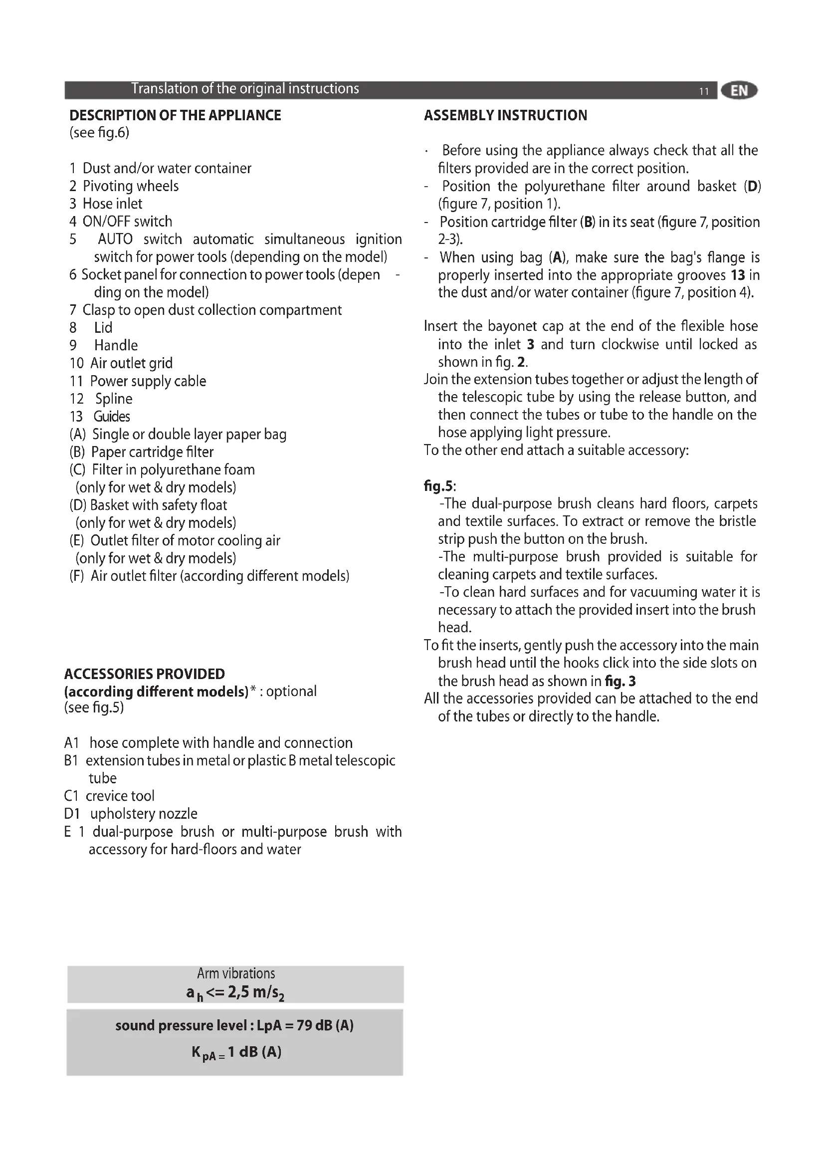 Before using the appliance always check that all the filters provided are in the correct position. - Position the polyurethane filter around basket (D) (figure 7, position 1). - Position cartridge filter (B) in its seat (figure 7, position 2-3). - When using bag (A), make sure the bag's flange is properly inserted into the appropriate grooves 13 in the dust and/or water container (figure 7, position 4). Insert the bayonet cap at the end of the flexible hose into the inlet 3 and turn clockwise until locked as shown in fig. 2. Join the extension tubes together or adjust the length of the telescopic tube by using the release button, and then connect the tubes or tube to the handle on the hose applying light pressure. To the other end attach a suitable accessory: fig.5: -The dual-purpose brush cleans hard floors, carpets and textile surfaces. To extract or remove the bristle strip push the button on the brush. -The multi-purpose brush provided is suitable for cleaning carpets and textile surfaces. -To clean hard surfaces and for vacuuming water it is necessary to attach the provided insert into the brush head. To fit the inserts, gently push the accessory into the main brush head until the hooks click into the side slots on the brush head as shown in fig. 3 All the accessories provided can be attached to the end of the tubes or directly to the handle. sound pressure level : LpA = 79 dB (A) Arm vibrations