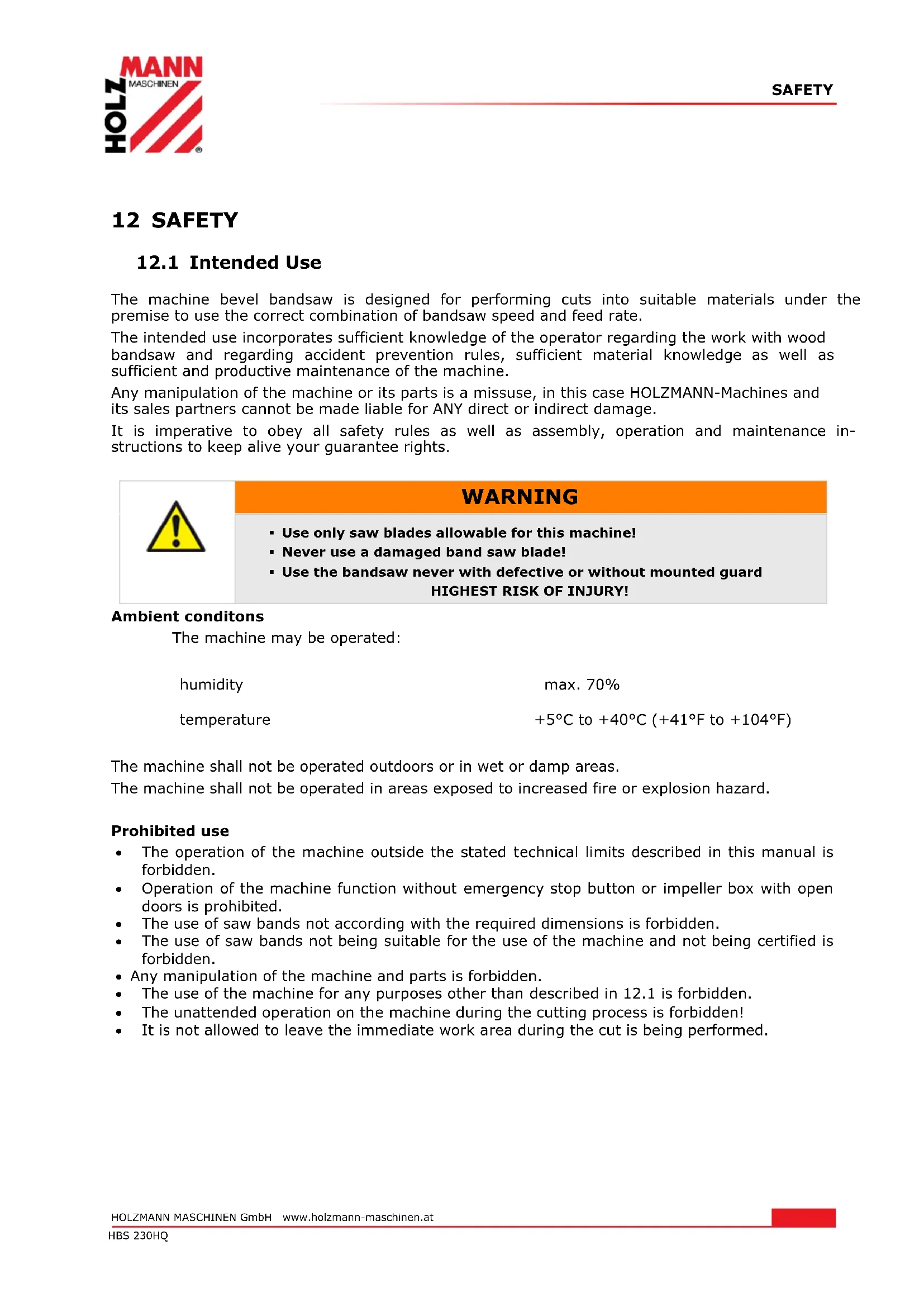 The machine shall not be operated outdoors or in wet or damp areas. The machine shall not be operated in areas exposed to increased fire or explosion hazard. Prohibited use The operation of the machine outside the stated technical limits described in this manual is forbidden. Operation of the machine function without emergency stop button or impeller box with open doors is prohibited. The use of saw bands not according with the required dimensions is forbidden. The use of saw bands not being suitable for the use of the machine and not being certified is forbidden. Any manipulation of the machine and parts is forbidden. The use of the machine for any purposes other than described in 12.1 is forbidden. The unattended operation on the machine during the cutting process is forbidden! It is not allowed to leave the immediate work area during the cut is being performed.SAFETY HOLZMANN MASCHINEN GmbH www.holzmann-maschinen.at 32 HBS 230HQ