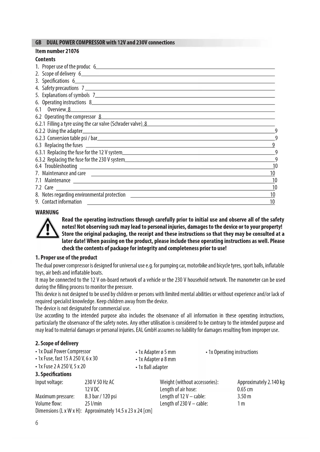 The dual power compressor is designed for universal use e.g. for pumping car, motorbike and bicycle tyres, sport balls, inatable toys, air beds and inatable boats. It may be connected to the 12 V on-board network of a vehicle or the 230 V household network. The manometer can be used during the lling process to monitor the pressure. This device is not designed to be used by children or persons with limited mental abilities or without experience and/or lack of required specialist knowledge. Keep children away from the device. The device is not designated for commercial use. Use according to the intended purpose also includes the observance of all information in these operating instructions, particularly the observance of the safety notes. Any other utilisation is considered to be contrary to the intended purpose and may lead to material damages or personal injuries. EAL GmbH assumes no liability for damages resulting from improper use.