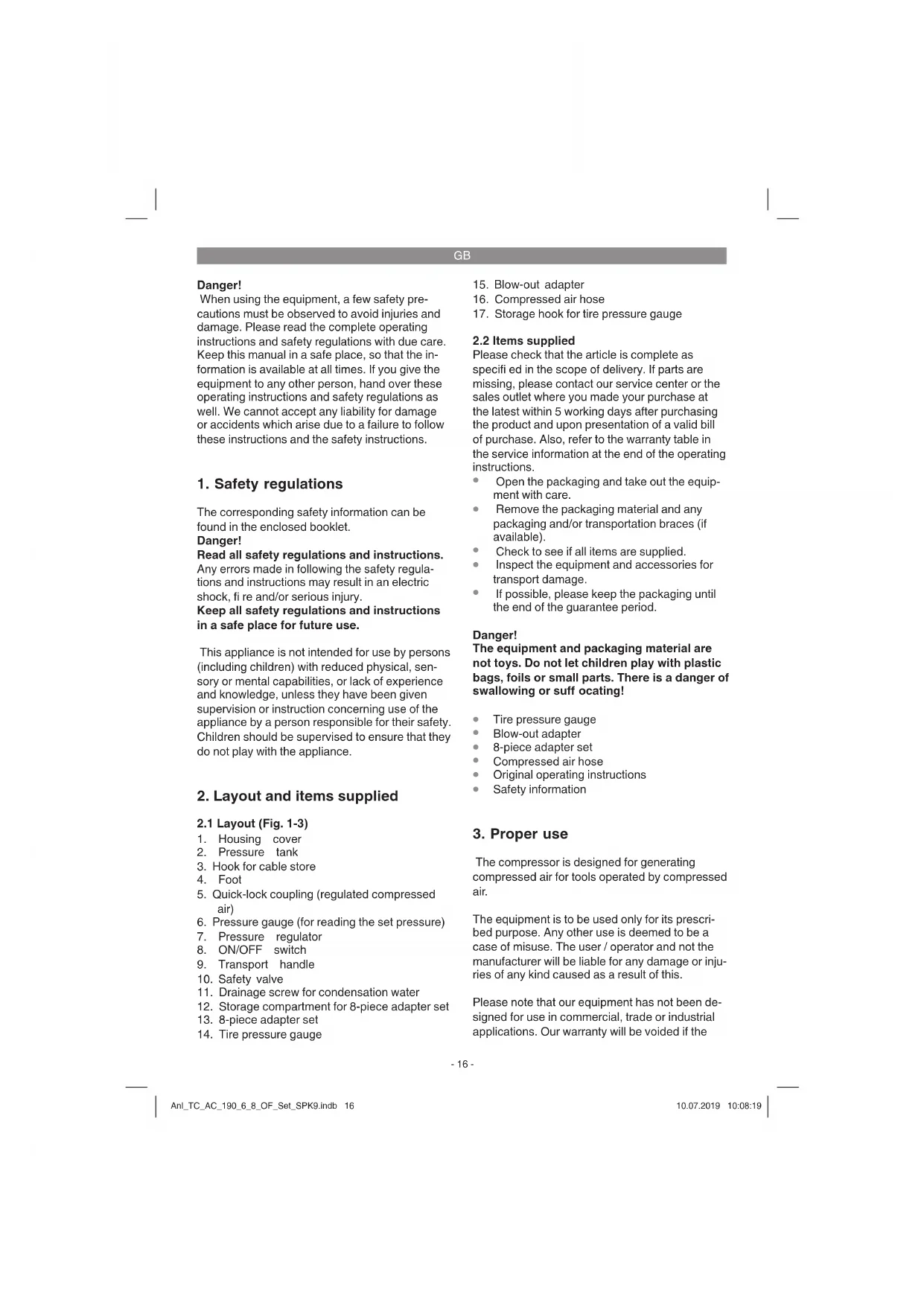 The compressor is designed for generating compressed air for tools operated by compressed air. The equipment is to be used only for its prescri- bed purpose. Any other use is deemed to be a case of misuse. The user / operator and not the manufacturer will be liable for any damage or inju- ries of any kind caused as a result of this. Please note that our equipment has not been de- signed for use in commercial, trade or industrial applications. Our warranty will be voided if the Anl_TC_AC_190_6_8_OF_Set_SPK9.indb 16Anl_TC_AC_190_6_8_OF_Set_SPK9.indb 16 10.07.2019 10:08:1910.07.2019 10:08:19GB