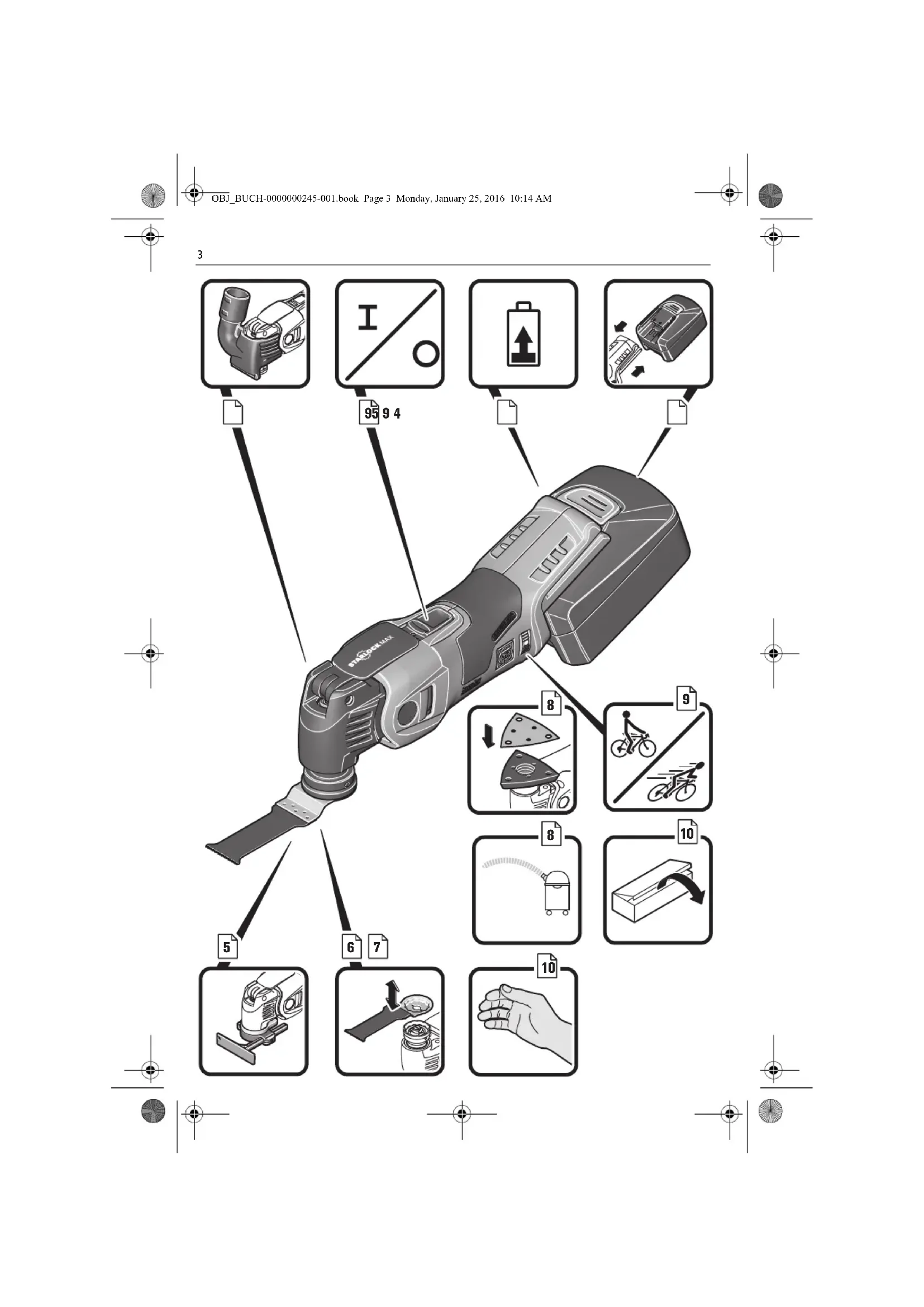Original Instructions. Symbols, abbreviations and terms used. Symbol, character Explanation Make sure to read the enclosed documents such as the Instruction Manual and the General Safety Instructions. Do not touch the saw blade. Danger of sharp application tools moving back and forth. Warning against sharp edges of application tools, such as the cutting edges of the cutter blades. Observe the instructions in the text or graphic opposite! General prohibition sign. This action is prohibited. Before commencing this working step, remove the battery from the power tool. Other- wise there may be danger of injury caused by unintentional starting of the power tool. Use eye protection during operation. Use ear protection during operation. Use a dust mask during operation. Use protective gloves during operation. Gripping surface Additional information. Do not charge damaged batteries. Keep the battery away from fire. Protect the battery against heat, e. g. against continuous intense sunlight. Observe the information in the adjacent text! Confirms the conformity of the power tool with the directives of the European Commu- nity. This symbol confirms the certification of this product for the USA and Canada. This sign indicates a possible dangerous situation that could cause severe or fatal injury. Recycling symbol: designates recyclable materials Worn out power tools and other electrotechnical and electrical products should be sorted separately for environmental-friendly recycling. Battery type Low oscillation rate High oscillation rate WARNING OBJ_BUCH-0000000245-001.book Page 16 Monday, January 25, 2016 10:14 AM17