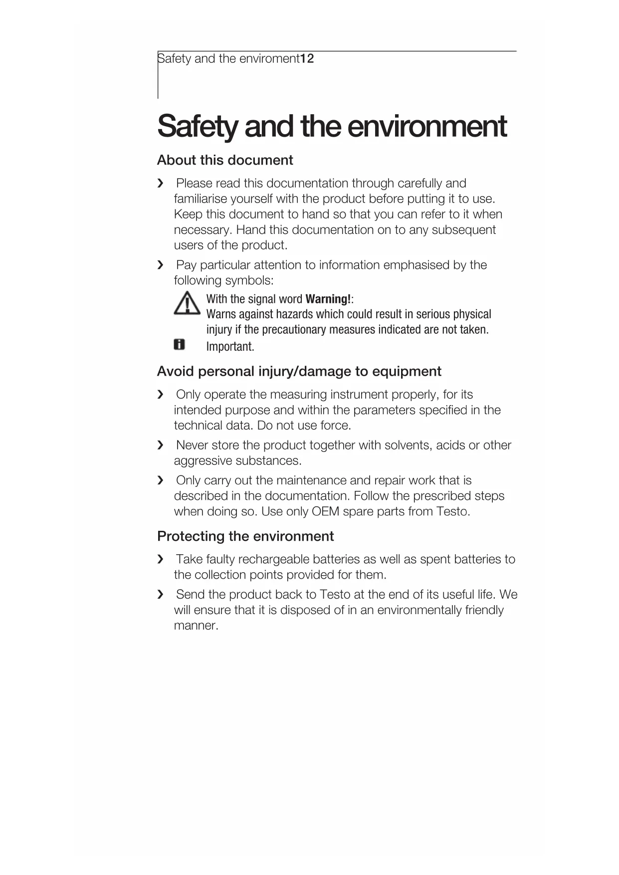 fresitptsvnl????Safety and the enviroment12 Safety and the environment About this document i Please read this documentation through carefully and familiarise yourself with the product before putting it to use. Keep this document to hand so that you can refer to it when necessary. Hand this documentation on to any subsequent users of the product. i Pay particular attention to information emphasised by the following symbols: With the signal word Warning!: Warns against hazards which could result in serious physical injury if the precautionary measures indicated are not taken. Important. Avoid personal injury/damage to equipment i Only operate the measuring instrument properly, for its intended purpose and within the parameters specified in the technical data. Do not use force. i Never store the product together with solvents, acids or other aggressive substances. i Only carry out the maintenance and repair work that is described in the documentation. Follow the prescribed steps when doing so. Use only OEM spare parts from Testo. Protecting the environment i Take faulty rechargeable batteries as well as spent batteries to the collection points provided for them. i Send the product back to Testo at the end of its useful life. We will ensure that it is disposed of in an environmentally friendly manner.Specification 13 Specifications Functions and use The testo 460 is a rotational speed measuring instrument. It is normally used to measure rotational speed, e.g. of impellers, drums and spindles. Technical data Measurement data