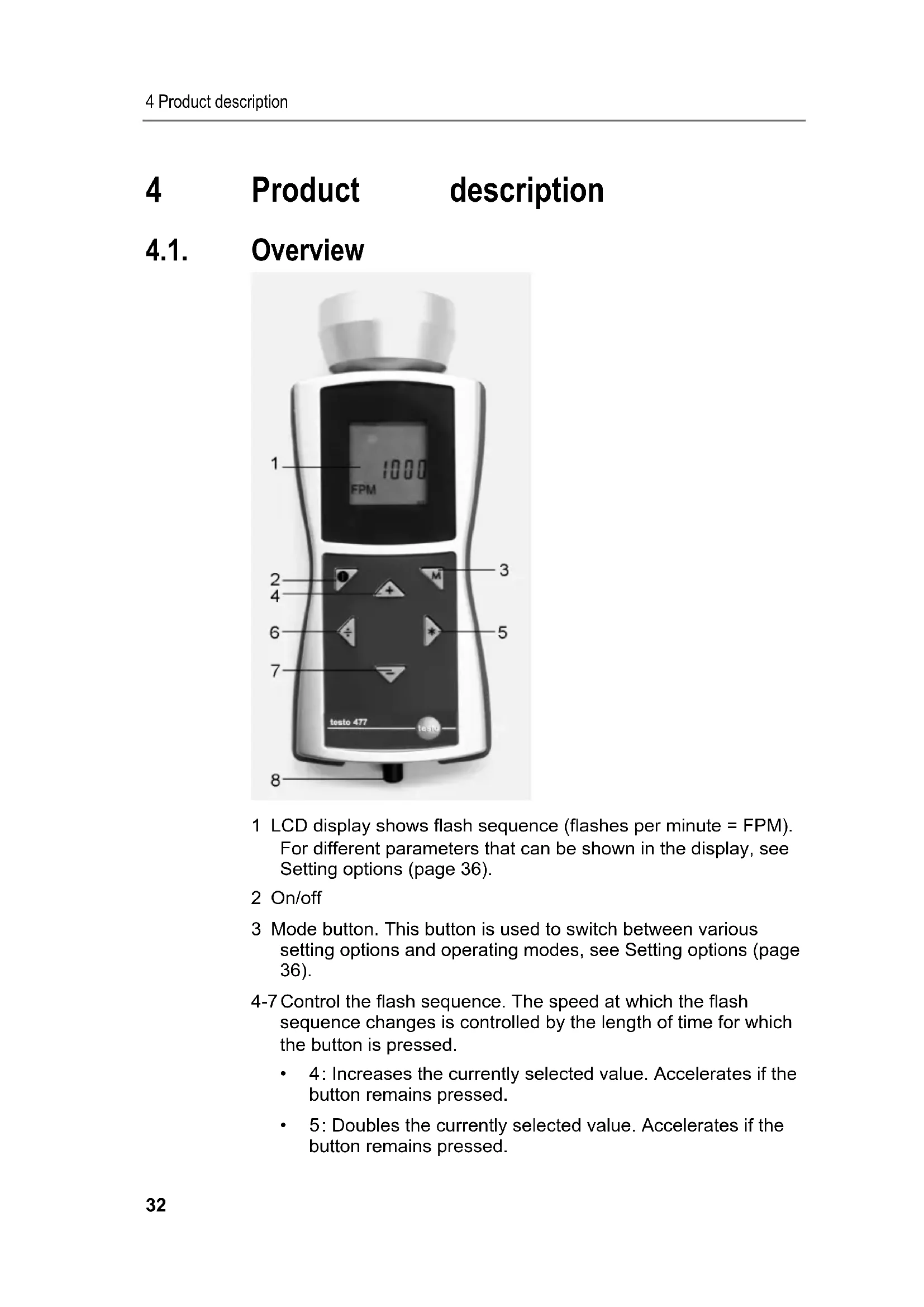 Pos: 17 /TD/Überschr iften/3. Leistungs beschreibung @ 0\mod_11737 74791554_79.doc @ 301 @ 1 3 Specifications Pos: 18 /TD/Leistungsb eschreibung/Ver wendung/testo 477 @ 4\mod_1 249031406678_79. doc @ 46665 @ 2 3.1. Use The testo 477 can be used in many areas of industry, research & development, in laboratories and universities. Normally, the testo 477 is used when the aim is to show fast- moving objects in slow motion. In this case, you can analyze their movement securely and smoothly, check for proper procedures and determine undesirable sources of vibrations etc. You can also use the testo 477 to seemingly "freeze" the movement of an object. Without making contact with the object, you can precisely determine its rotational speed or the frequency of shifts in direction. Compared to other portable stroboscopes, the testo 477 LED stroboscope can be operated with just one hand. Customary uses/applications: