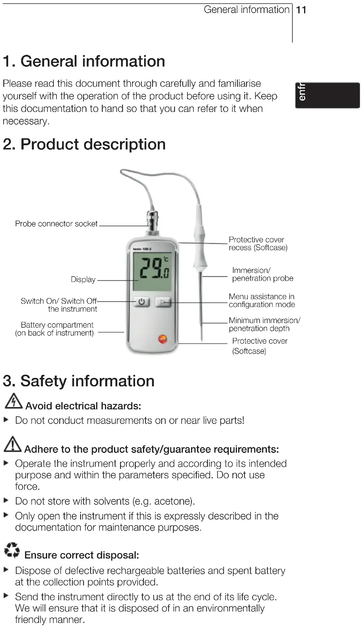 enfresitptsvnl???? General information Switch On/ Switch Off the instrument Battery compartment (on back of instrument) Display Protective cover (Softcase) Probe connector socket Menu assistance in configuration mode Protective cover recess (Softcase) Immersion/ penetration probe Minimum immersion/ penetration depth12