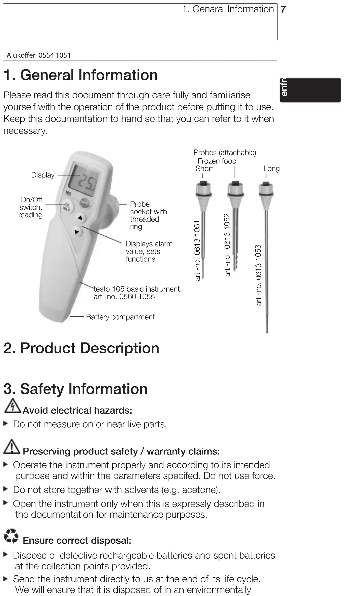 ??12 testo 105 with penetration probes short, long and frozen food, belt holder 0563 1052 testo 105 with frozen food penetration probe, belt holder 0563 1054 Aluminium case 0554 105113