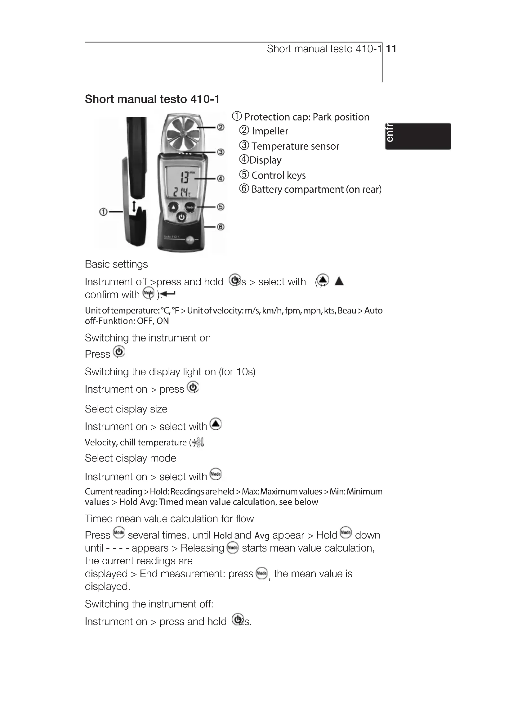 ??Notizen10Short manual testo 410-1 11 Short manual testo 410-1 À Protection cap: Park position Á Impeller  Temperature sensor à Display Ä Control keys Å Battery compartment (on rear) Basic settings Instrument off >press and hold 2s > select with ( ), confirm with ( ): Unit of temperature: °C, °F > Unit of velocity: m/s, km/h, fpm, mph, kts, Beau > Auto off-Funktion: OFF, ON Switching the instrument on Press . Switching the display light on (for 10s) Instrument on > press . Select display size Instrument on > select with : Velocity, chill temperature ( ) Select display mode Instrument on > select with : Current reading > Hold: Readings are held > Max: Maximum values > Min: Minimum values > Hold Avg: Timed mean value calculation, see below Timed mean value calculation for flow Press several times, until Hold and Avg appear > Hold down until - - - - appears > Releasing starts mean value calculation, the current readings are displayed > End measurement: press