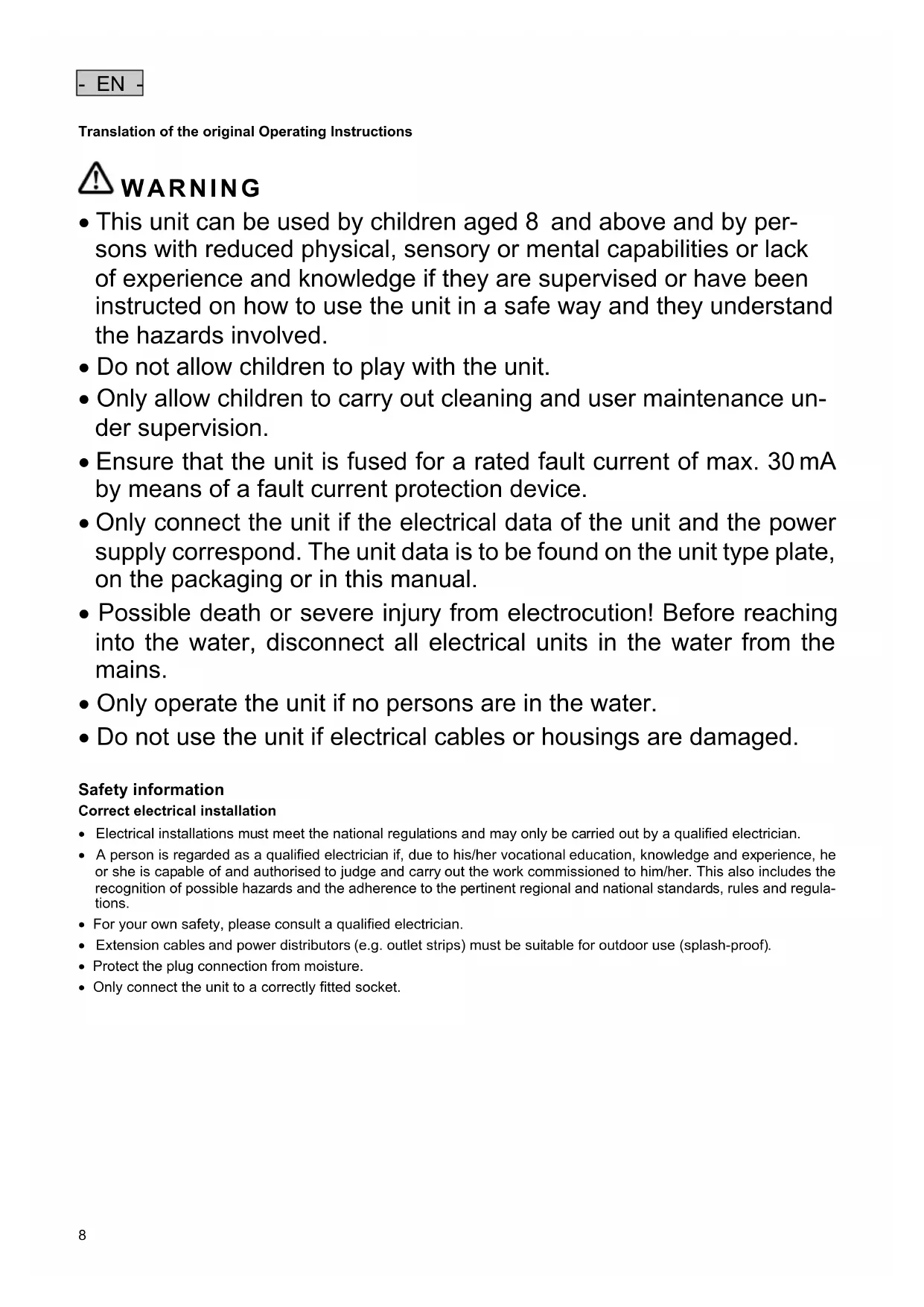 WARNING This unit can be used by children aged 8 and above and by per- sons with reduced physical, sensory or mental capabilities or lack of experience and knowledge if they are supervised or have been instructed on how to use the unit in a safe way and they understand the hazards involved. Do not allow children to play with the unit. Only allow children to carry out cleaning and user maintenance un- der supervision. Ensure that the unit is fused for a rated fault current of max. 30 mA by means of a fault current protection device. Only connect the unit if the electrical data of the unit and the power supply correspond. The unit data is to be found on the unit type plate, on the packaging or in this manual. Possible death or severe injury from electrocution! Before reaching into the water, disconnect all electrical units in the water from the mains. Only operate the unit if no persons are in the water. Do not use the unit if electrical cables or housings are damaged.