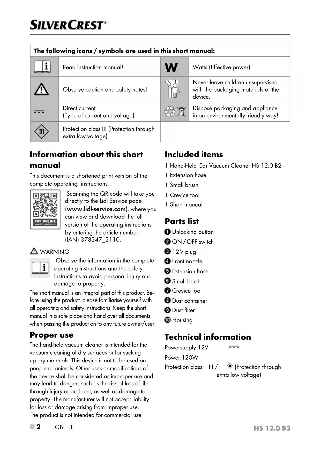 Information about this short manual This document is a shortened print version of the complete operating instructions. Scanning the QR code will take you directly to the Lidl Service page (www.lidl-service.com), where you can view and download the full version of the operating instructions by entering the article number (IAN) 378247_2110. WARNING! Observe the information in the complete operating instructions and the safety instructions to avoid personal injury and damage to property. The short manual is an integral part of this product. Be- fore using the product, please familiarise yourself with all operating and safety instructions. Keep the short manual in a safe place and hand over all documents when passing the product on to any future owner/user. Proper use The hand-held vacuum cleaner is intended for the vacuum cleaning of dry surfaces or for sucking up dry materials. This device is not to be used on people or animals. Other uses or modifications of the device shall be considered as improper use and may lead to dangers such as the risk of loss of life through injury or accident, as well as damage to property. The manufacturer will not accept liability for loss or damage arising from improper use. The product is not intended for commercial use. Included items 1 Hand-Held Car Vacuum Cleaner HS 12.0 B2 1 Extension hose 1 Small brush 1 Crevice tool 1 Short manual Parts list Unlocking button ON / OFF switch 12 V plug Front nozzle Extension hose Small brush Crevice tool Dust container Dust filter Housing Technical information Power supply: 12 V Power: 120 W Protection class: III / (Protection through extra low voltage) The following icons / symbols are used in this short manual: Read instruction manual!