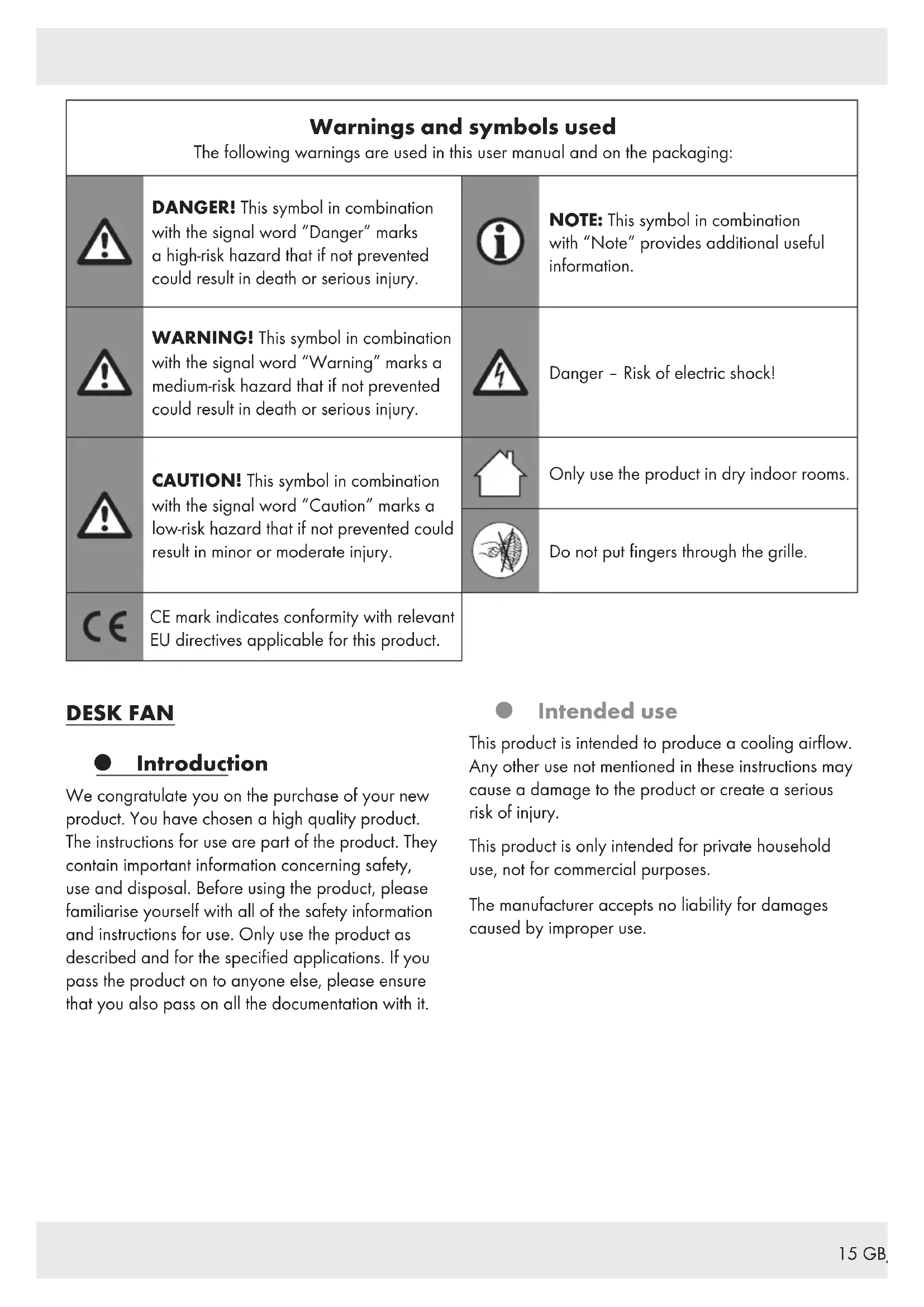 ALL THE DOCUMENTS! In the case of damage resulting from non-compliance with these operating instructions the warranty claim becomes invalid! No liability is accepted for consequential damage! In the case of material damage or personal injury caused by incorrect handling or non-compliance with the safety instructions, no liability is accepted! Children and persons with disabilities mDANGER! Risk of suffocation! Never leave children unsupervised with the packaging material. The packaging material represents a danger of suffocation. Children frequently underestimate the dangers. Always keep children away from the packaging material. This product can be used by children aged from 8 years and above and persons with reduced physical, sensory or mental capabilities, or lack of experience and knowledge if they have been given supervision or instruction concerning use of the product in a safe way and understand the hazards involved. Cleaning and user maintenance shall not be made by children without supervision. Children shall not play with the product.18 GB/IE Electrical safety mWARNING! Risk of injury! Switch the product off and disconnect it from the power supply before cleaning work and when not in use. mWARNING! Risk of electric shock! Ensure the rated voltage shown on the rating label corresponds with the voltage of the power supply. mWARNING! Risk of electric shock! If the supply cord is damaged, it must be replaced by the manufacturer, its service agent or similarly qualified persons in order to avoid a hazard. Operation Only use the product in dry indoor rooms. Protect the product, its power cord and power plug against dust, direct sunlight, dripping and splashing water. mCAUTION! Risk of injury! Ensure that the fan is switched off from the supply mains before removing the guard. mCAUTION! Risk of injury! Never use the product without the safety grille or with a damaged safety grille. mCAUTION! Risk of injury! During use, keep hands, hair, clothing and utensils away from the safety grille to avoid injuries and damage of the product.19 GB/IE Before use Unpacking Remove the packaging. Check if the product is damaged. Assembly Accessory needed: Cross head screwdriver Number of persons needed for assembly: 1 adult Fig. Step