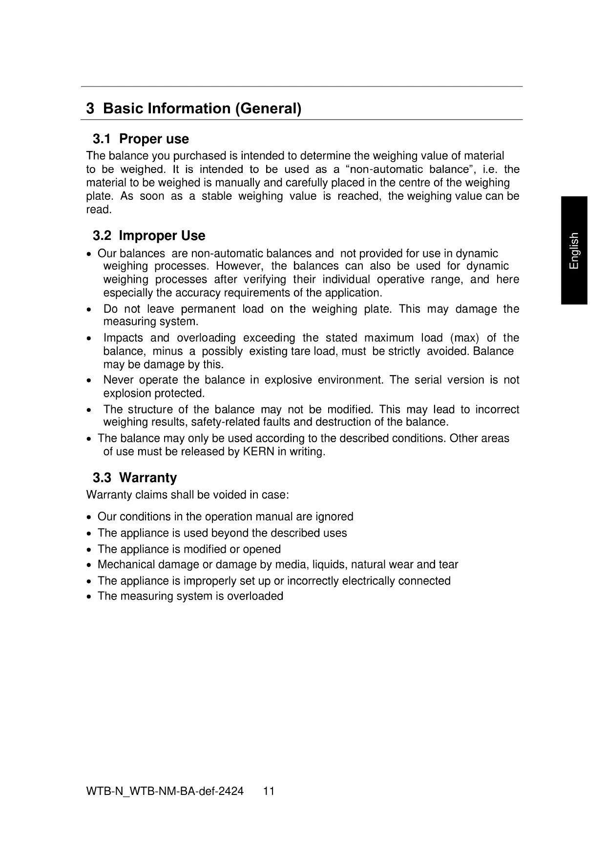 IP protection IP654 WTB-N_WTB-NM-BA-def-2424 English KERN WTB 10K -3N WTB 30K -3N Weighing range (max) 15 kg 30 kg Readability (d) 2 g 5 g Reproducibility 2 g 5 g Linearity ±4 g ±10 g Recommended adjustment weight, not added (class) 15 kg (M1) 30 kg (M1) Stabilization time (typical) 2 sec. Units
