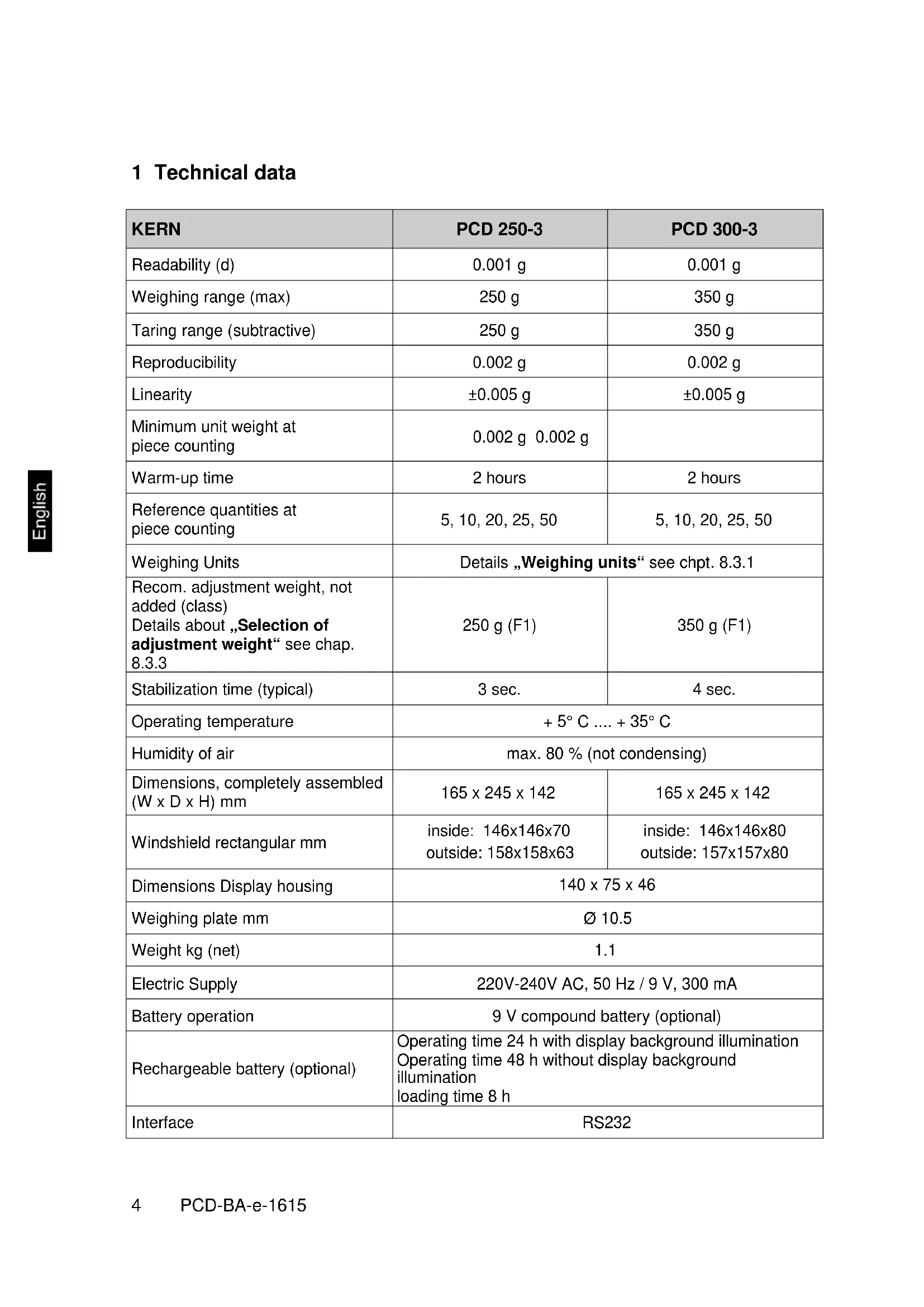 2500 g (F1) 3 kg (F1) Stabilization time (typical) 3 sec. Operating temperature + 5° C .... + 35° C Humidity of air max. 80 % (not condensing) Dimensions, completely assembled (W x D x H) mm 165 x 280 x 73 Dimensions Display housing 140 x 75 x 46 Weighing plate mm 160x160 Weight kg (net) 1.6 1.9 Electric Supply 220V-240V AC, 50 Hz / 9 V, 300 mA Battery operation 9 V compound battery (optional) Rechargeable battery (optional) Operating time 24 h with display background illumination Operating time 48 h without display background illumination loading time 8 h Interface RS2326 PCD-BA-e-1615 KERN PCD 6K-4 PCD 10K0.1 PCD 10K3 Readability (d) 0.1 g 0.1 g 1 g Weighing range (max) 6000 g 10 kg 10 kg Taring range (subtractive) 6000 g 10 kg 10 kg Reproducibility 0.1 g 0.1 g 1 g Linearity ±0.3 g ±0.3 g ±3 g Minimum unit weight at piece counting