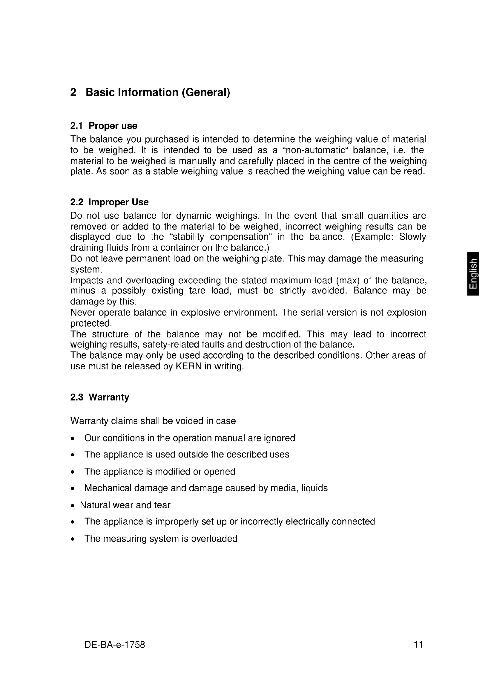 Do not use balance for dynamic weighings. In the event that small quantities are removed or added to the material to be weighed, incorrect weighing results can be displayed due to the “stability compensation“ in the balance. (Example: Slowly draining fluids from a container on the balance.) Do not leave permanent load on the weighing plate. This may damage the measuring system. Impacts and overloading exceeding the stated maximum load (max) of the balance, minus a possibly existing tare load, must be strictly avoided. Balance may be damage by this. Never operate balance in explosive environment. The serial version is not explosion protected. The structure of the balance may not be modified. This may lead to incorrect weighing results, safety-related faults and destruction of the balance. The balance may only be used according to the described conditions. Other areas of use must be released by KERN in writing.