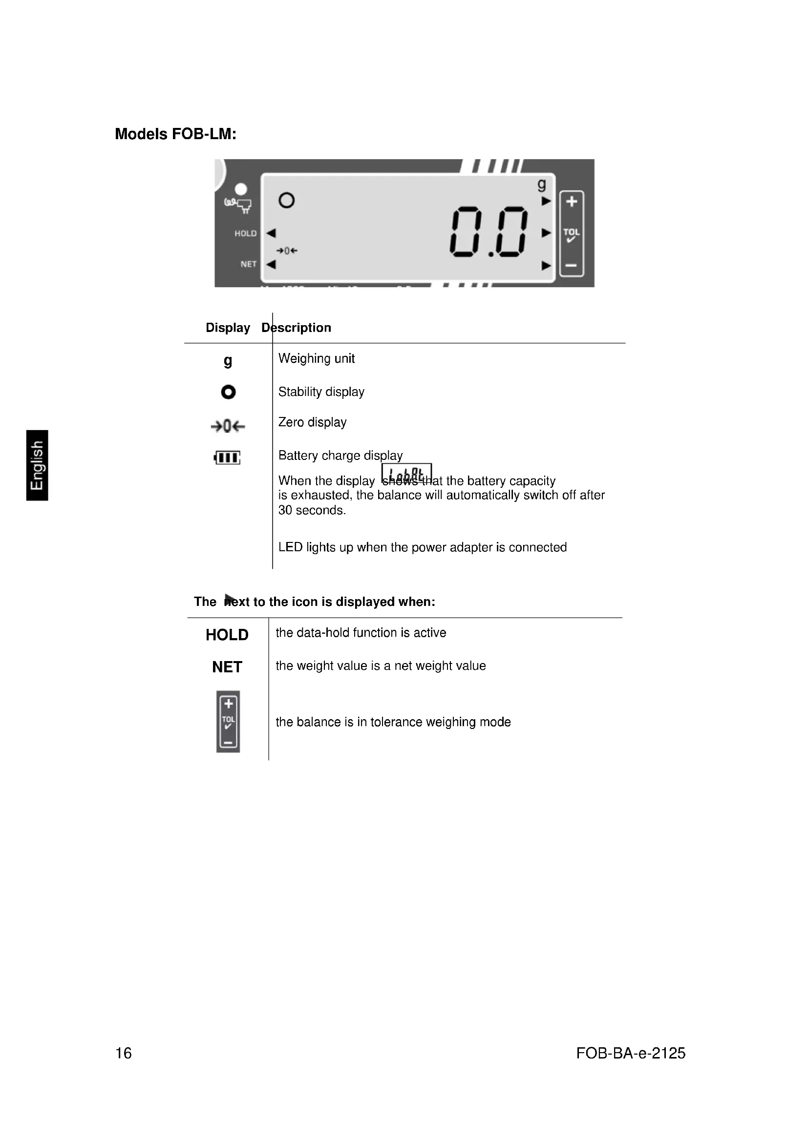 Weighing unit Stability display Zero display Battery charge display When the display shows that the battery capacity is exhausted, the balance will automatically switch off after 30 seconds. LED lights up when the power adapter is connectedFOB-BA-e-2125 17 Models FOB: