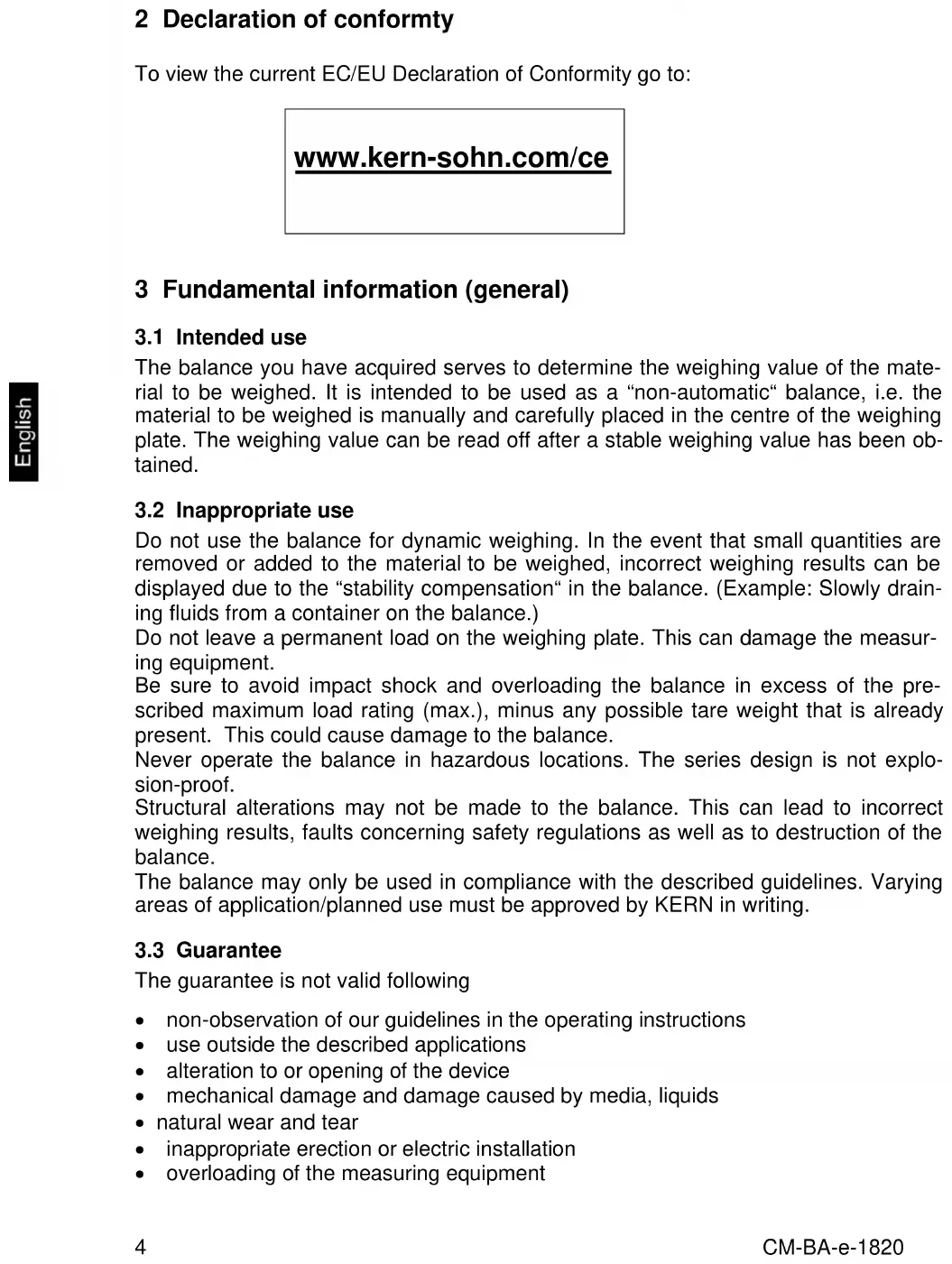 The metrology features of the balance and any possible available adjusting weight must be checked at regular intervals within the scope of quality assurance. For this purpose, the answerable user must define a suitable interval as well as the nature and scope of this check. Information is available on KERN’s home page (www.kern- sohn.com) with regard to the monitoring of balance test substances and the test weights required for this. Test weights and balances can be adjusted quickly and at a reasonable price in KERN’s accredited DKD calibration laboratory (return to na- tional normal). 4 Fundamental safety information
