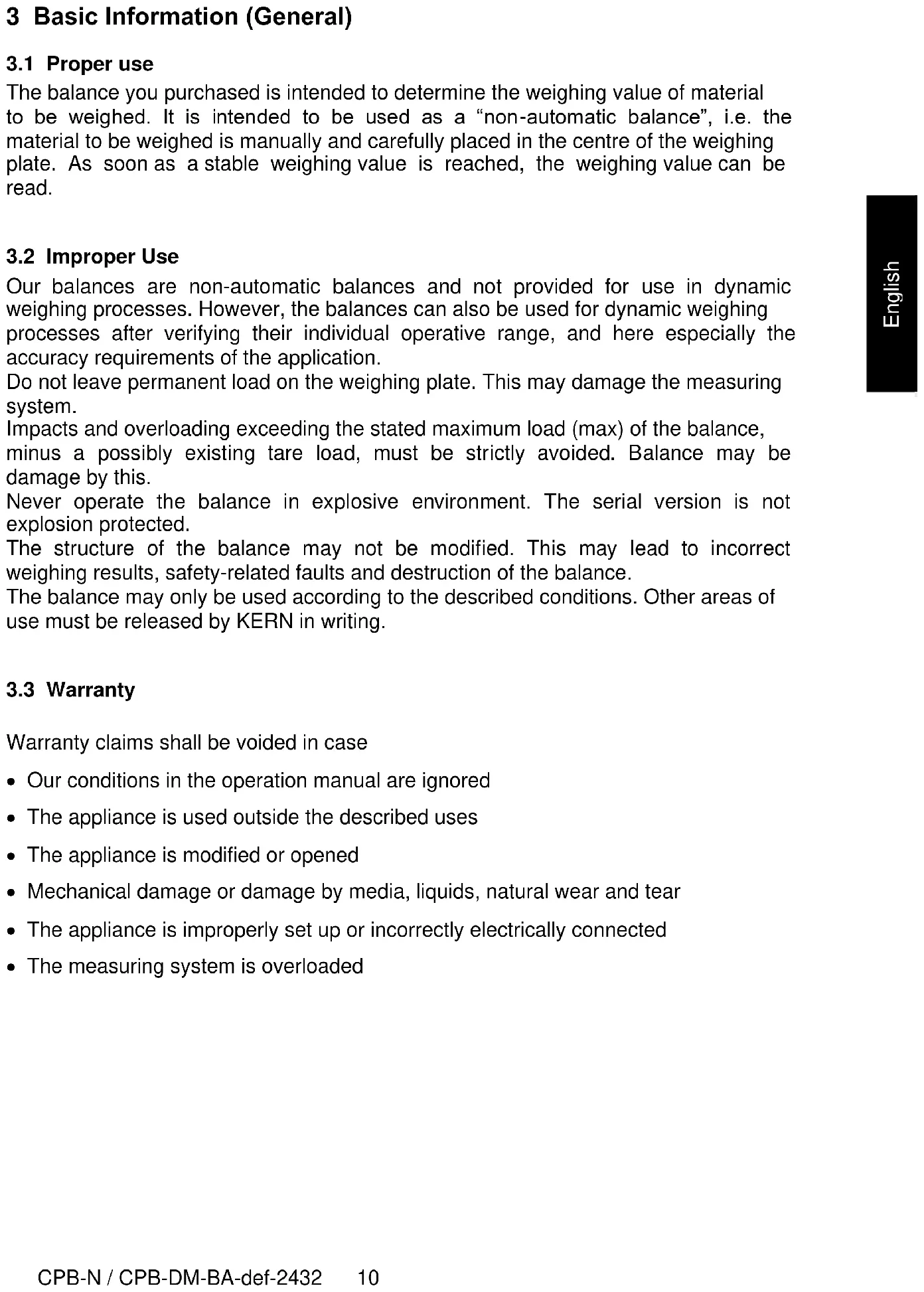 Our balances are non-automatic balances and not provided for use in dynamic weighing processes. However, the balances can also be used for dynamic weighing processes after verifying their individual operative range, and here especially the accuracy requirements of the application. Do not leave permanent load on the weighing plate. This may damage the measuring system. Impacts and overloading exceeding the stated maximum load (max) of the balance, minus a possibly existing tare load, must be strictly avoided. Balance may be damage by this. Never operate the balance in explosive environment. The serial version is not explosion protected. The structure of the balance may not be modified. This may lead to incorrect weighing results, safety-related faults and destruction of the balance. The balance may only be used according to the described conditions. Other areas of use must be released by KERN in writing.