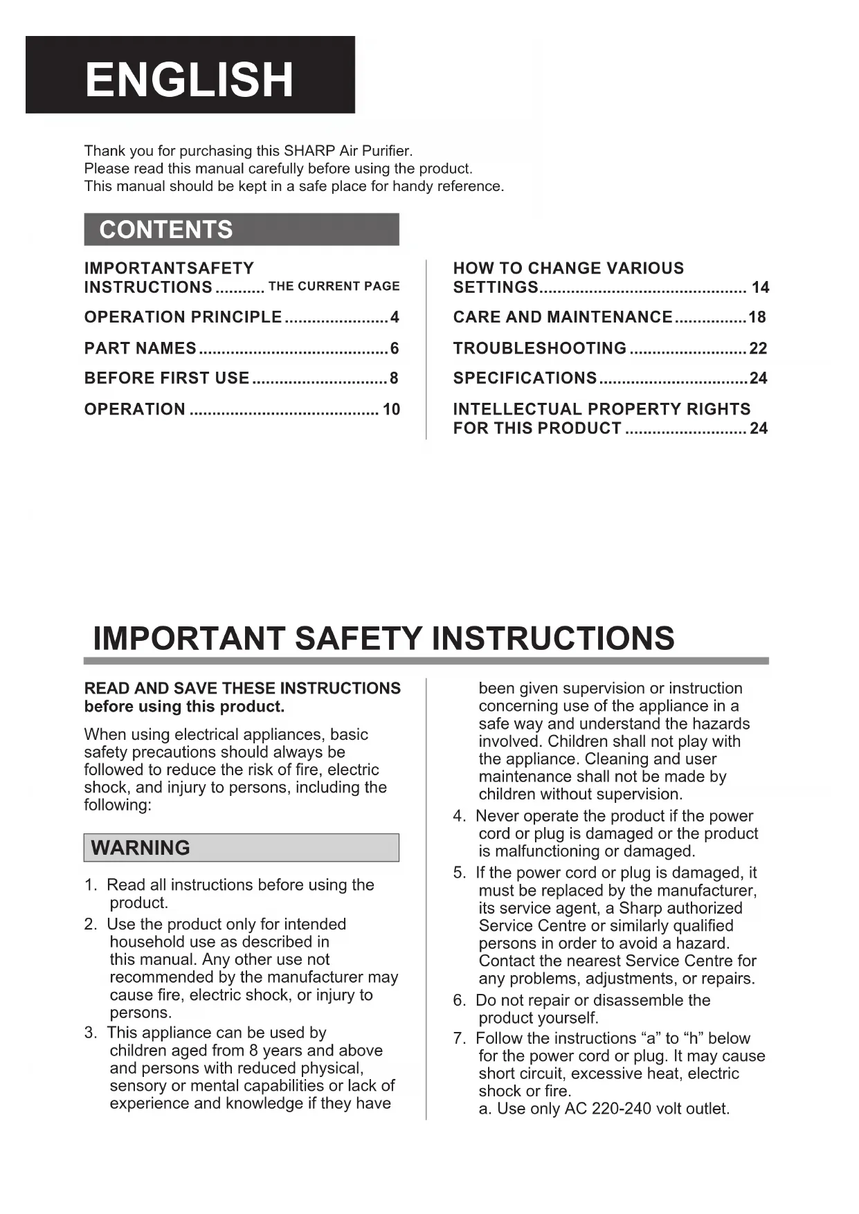 for the power cord or plug. It may cause short circuit, excessive heat, electric shock or fire. a. Use only AC 220-240 volt outlet. Thank you for purchasing this SHARP Air Purifier.Please read this manual carefully before using the product.This manual should be kept in a safe place for handy reference. ENGLISH IMPORTANT SAFETY INSTRUCTIONS ...........