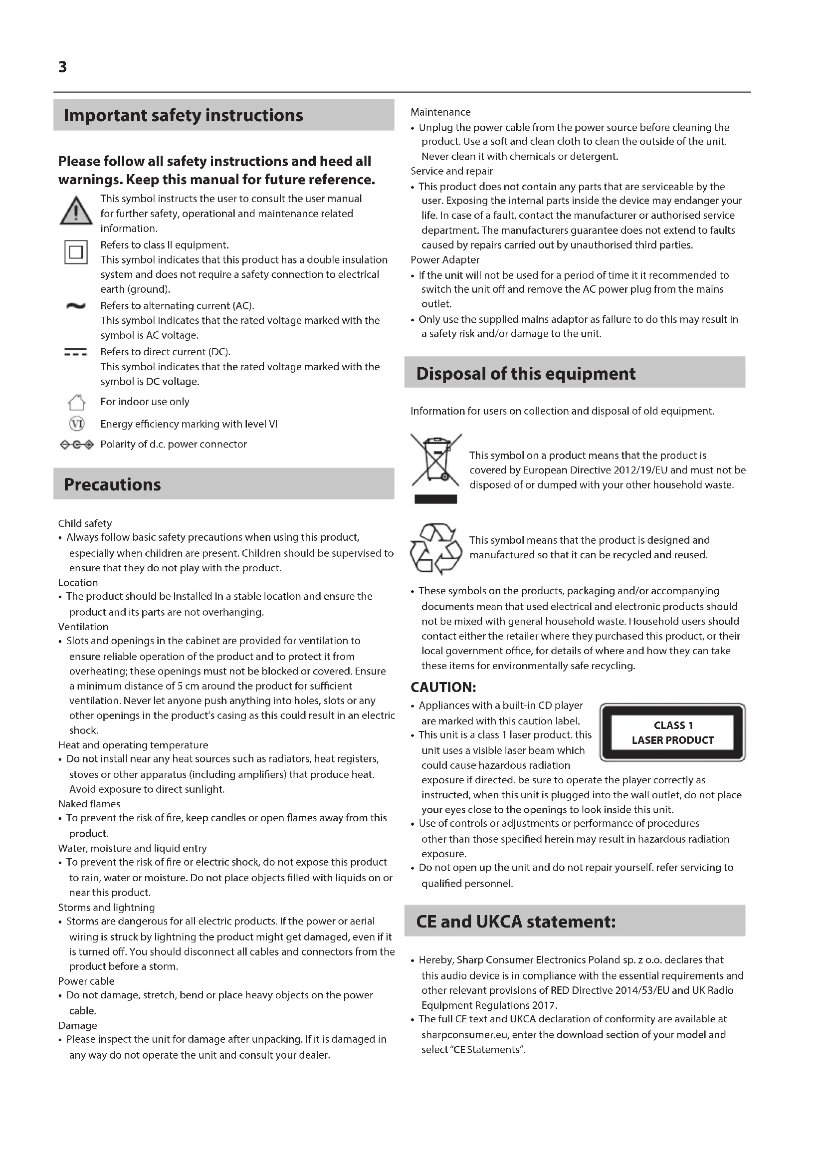- Hereby, Sharp Consumer Electronics Poland sp. z o.o. declares that this audio device is in compliance with the essential requirements and other relevant provisions of RED Directive 2014/53/EU and UK Radio Equipment Regulations 2017.