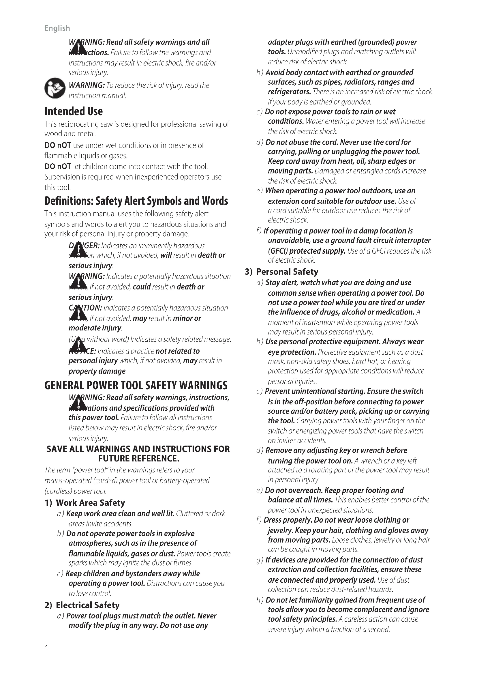 - Use extra caution when cutting overhead and pay particular attention to overhead wires which may be hidden from view. Anticipate the path of falling branches and debris ahead of time. Safety Instructions for ReciprocatingSaws
