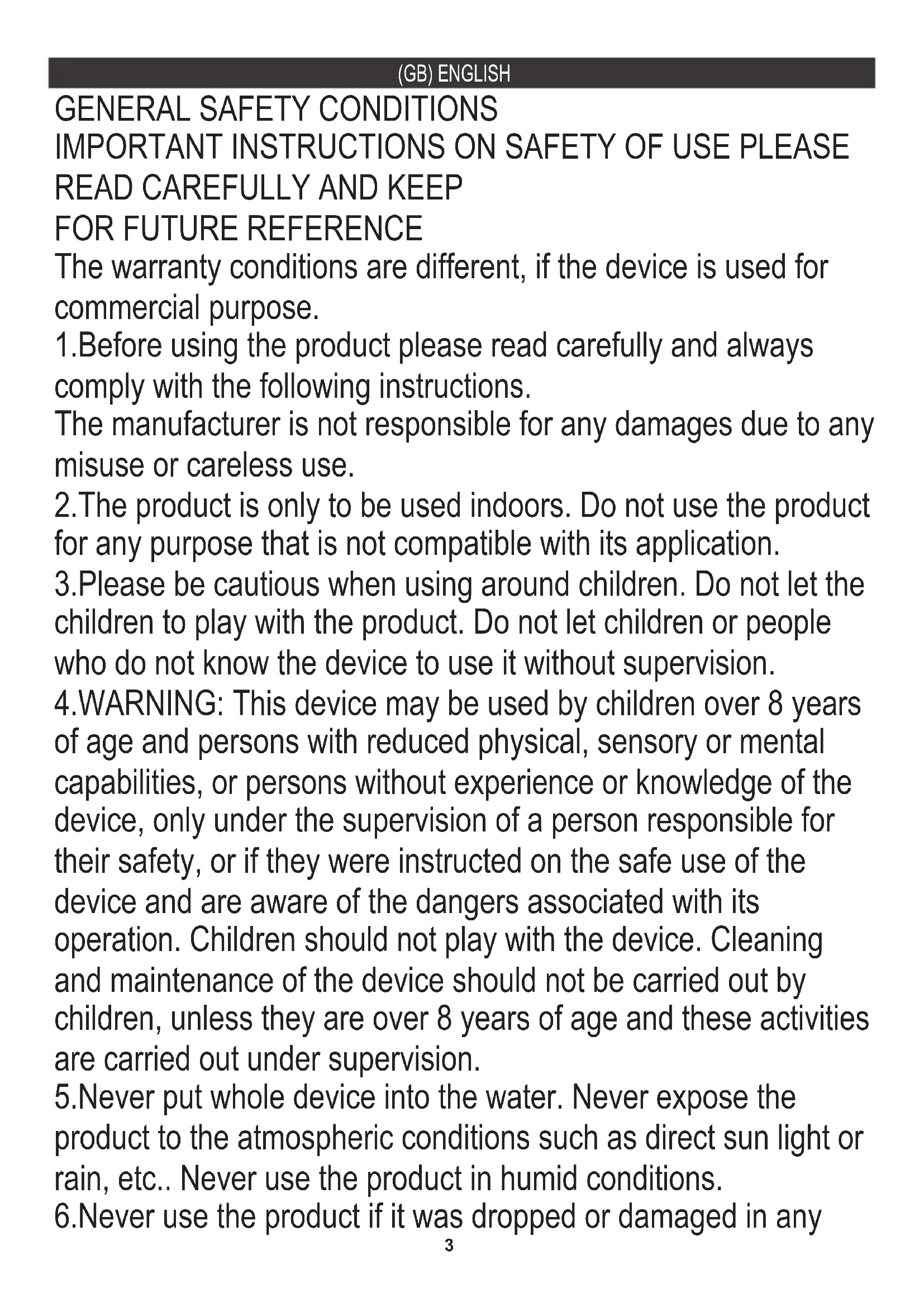 The warranty conditions are different, if the device is used for commercial purpose. 1.Before using the product please read carefully and always comply with the following instructions. The manufacturer is not responsible for any damages due to any misuse or careless use. 2.The product is only to be used indoors. Do not use the product for any purpose that is not compatible with its application. 4.WARNING: This device may be used by children over 8 years of age and persons with reduced physical, sensory or mental capabilities, or persons without experience or knowledge of the device, only under the supervision of a person responsible for their safety, or if they were instructed on the safe use of the device and are aware of the dangers associated with its operation. Children should not play with the device. Cleaning and maintenance of the device should not be carried out by children, unless they are over 8 years of age and these activities are carried out under supervision. 6.Never use the product if it was dropped or damaged in any 3.Please be cautious when using around children. Do not let the children to play with the product. Do not let children or people who do not know the device to use it without supervision. 5.Never put whole device into the water. Never expose the product to the atmospheric conditions such as direct sun light or rain, etc.. Never use the product in humid conditions.4 7.Do not try to repair the defected product yourself because it can lead to electric shock. Damaged device always turn to a professional service location in order to repair it. All the repairs can be done only by authorized service professionals. The repair that was done incorrectly can cause hazardous situations for the user.