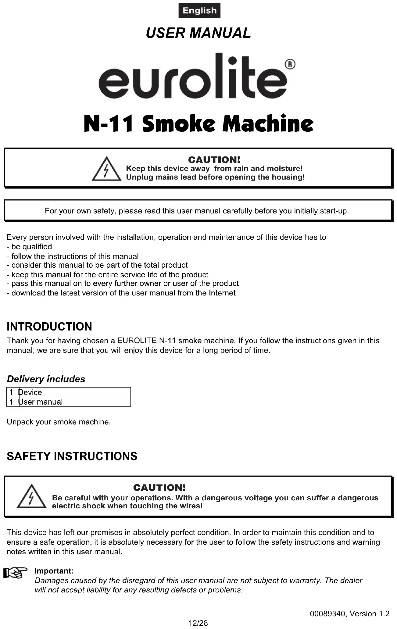 For your own safety, please read this user manual carefully before you initially start-up. Every person involved with the installation, operation and maintenance of this device has to - be qualified - follow the instructions of this manual - consider this manual to be part of the total product - keep this manual for the entire service life of the product - pass this manual on to every further owner or user of the product - download the latest version of the user manual from the Internet INTRODUCTION Thank you for having chosen a EUROLITE N-11 smoke machine. If you follow the instructions given in this manual, we are sure that you will enjoy this device for a long period of time. Delivery includes 1 Device 1 User manual Unpack your smoke machine. SAFETY INSTRUCTIONS CAUTION!Becarefulwithyouroperations.Withadangerousvoltageyoucansufferadangerouselectricshockwhentouchingthewires!