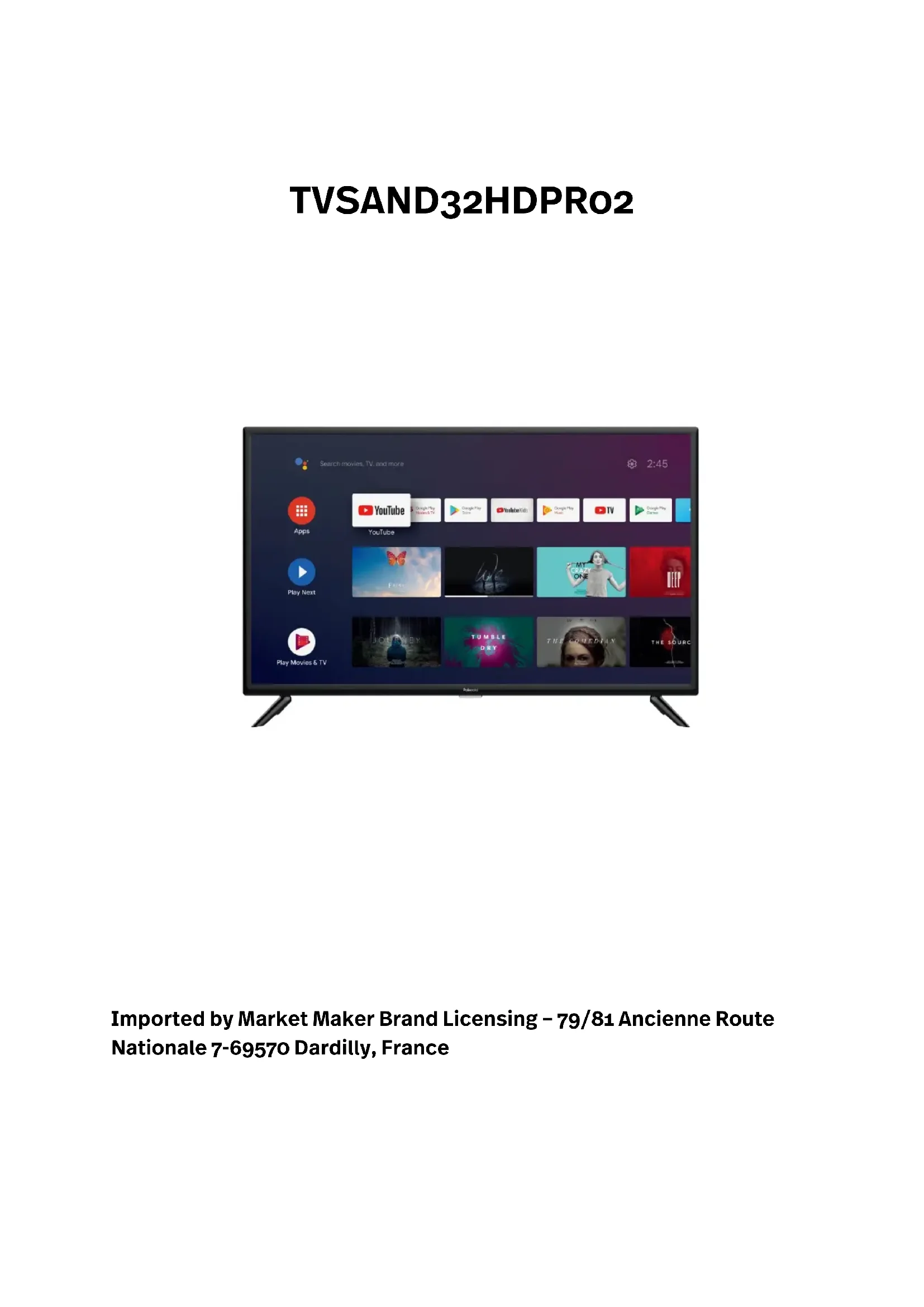 Declaration of conformity EU: Market Maker Brand Licensing, hereby declares that this equipment, conforms to the essential requirements and other relevant provisions of Directive 2014/53/UE. The declaration of Conformity can be viewed at the following address: http://www.mms-support.net/OTA/ECD_MMBL_ TVSAND32HDPR02© 2020.
