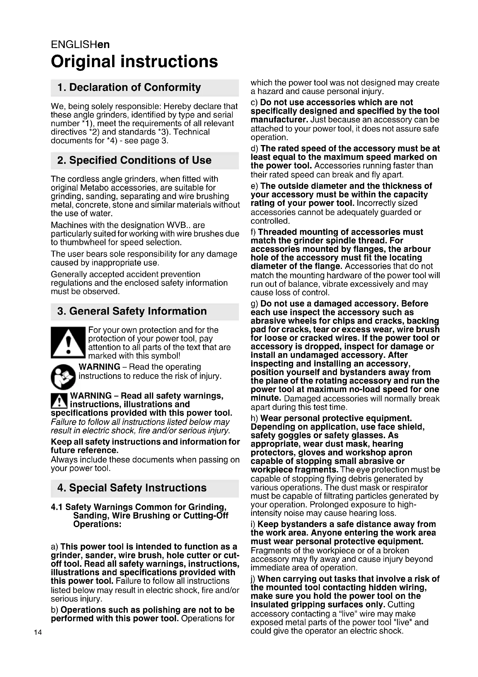 Original instructions We, being solely responsible: Hereby declare that these angle grinders, identified by type and serial number *1), meet the requirements of all relevant directives *2) and standards *3). Technical documents for *4) - see page 3. The cordless angle grinders, when fitted with original Metabo accessories, are suitable for grinding, sanding, separating and wire brushing metal, concrete, stone and similar materials without the use of water. Machines with the designation WVB.. are particularly suited for working with wire brushes due to thumbwheel for speed selection. The user bears sole responsibility for any damage caused by inappropriate use. Generally accepted accident prevention regulations and the enclosed safety information must be observed. For your own protection and for the protection of your power tool, pay attention to all parts of the text that are marked with this symbol! WARNING – Read the operating instructions to reduce the risk of injury. WARNING – Read all safety warnings, instructions, illustrations and specifications provided with this power tool. Failure to follow all instructions listed below may result in electric shock, fire and/or serious injury. Keep all safety instructions and information for future reference. Always include these documents when passing on your power tool.