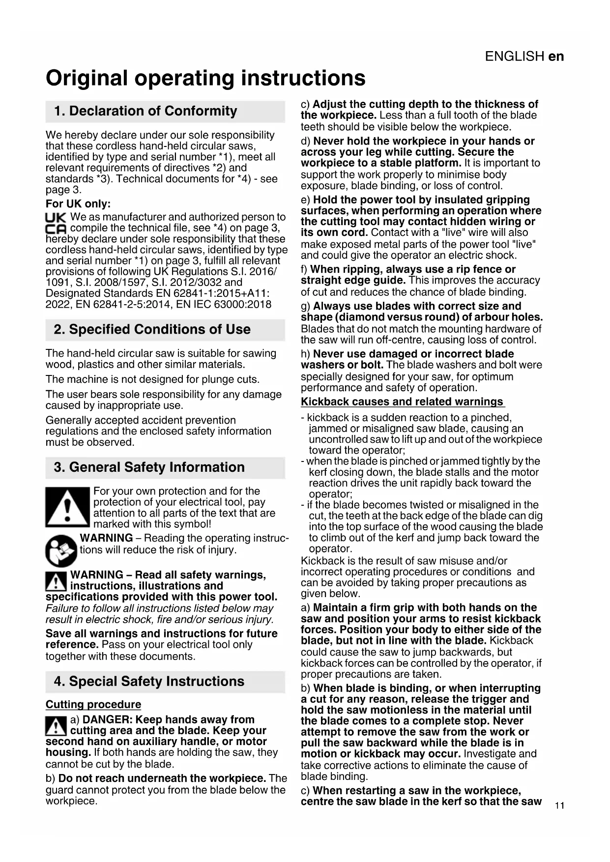Original operating instructions We hereby declare under our sole responsibility that these cordless hand-held circular saws, identified by type and serial number *1), meet all relevant requirements of directives *2) and standards *3). Technical documents for *4) - see page 3. For UK only: We as manufacturer and authorized person to compile the technical file, see *4) on page 3, hereby declare under sole responsibility that these cordless hand-held circular saws, identified by type and serial number *1) on page 3, fulfill all relevant provisions of following UK Regulations S.I. 2016/ 1091, S.I. 2008/1597, S.I. 2012/3032 and Designated Standards EN 62841-1:2015+A11: