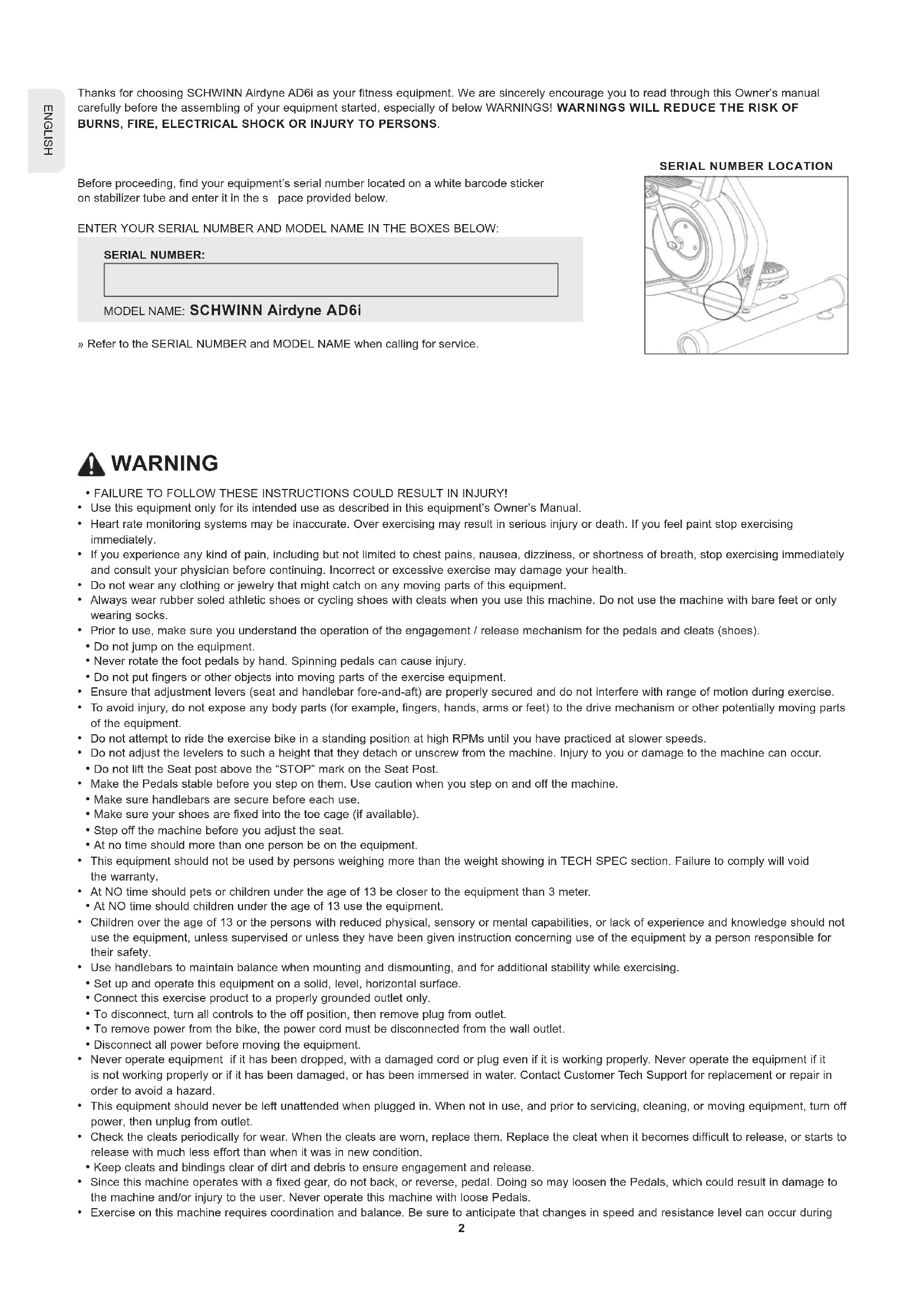 Thanks for choosing SCHWINN Airdyne AD6i as your fitness equipment. We are sincerely encourage you to read through this Owner's manual carefully before the assembling of your equipment started, especially of below WARNINGS! WARNINGS WILL REDUCE THE RISK OF BURNS, FIRE, ELECTRICAL SHOCK OR INJURY TO PERSONS.