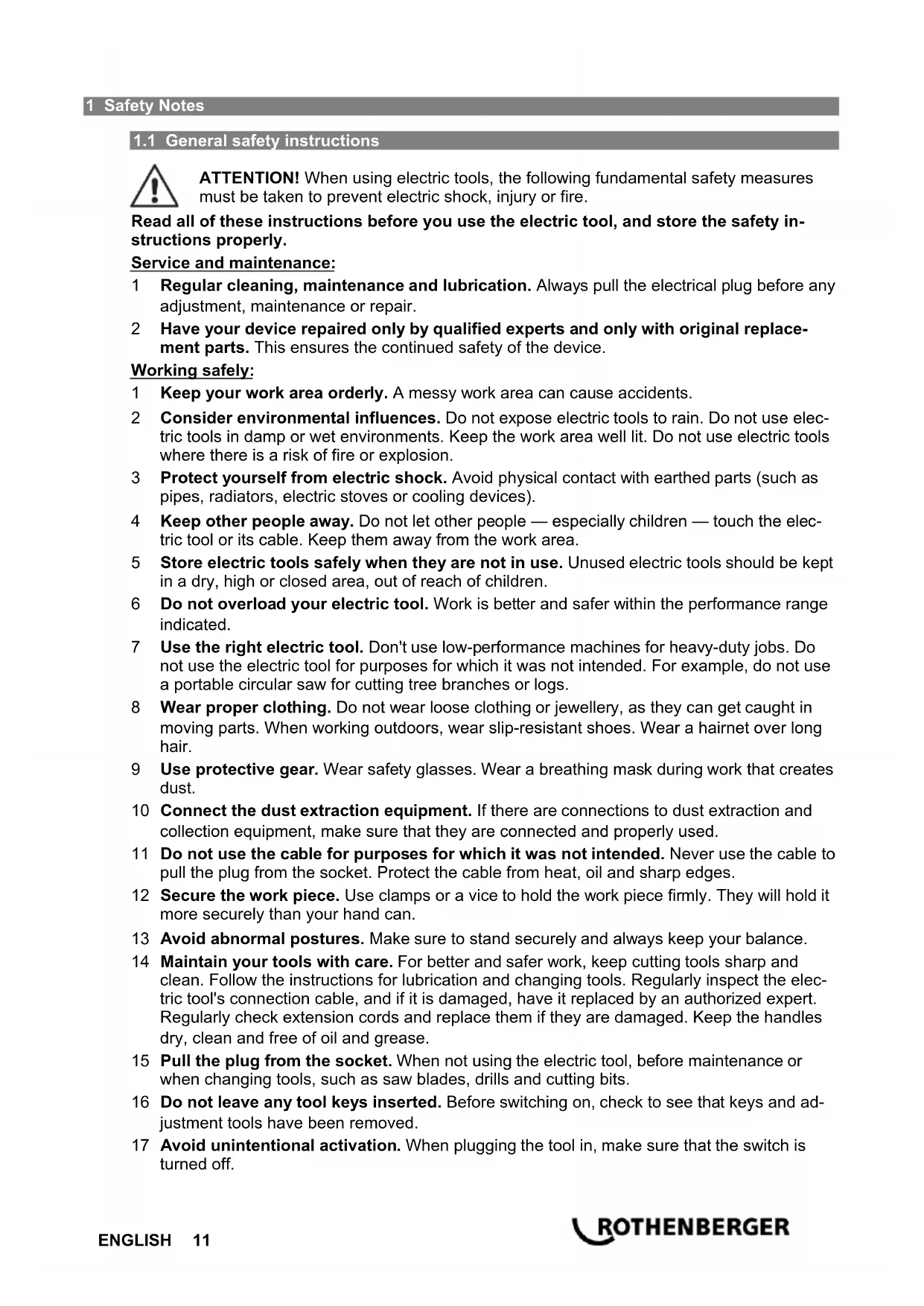 ATTENTION! When using electric tools, the following fundamental safety measures must be taken to prevent electric shock, injury or fire. Read all of these instructions before you use the electric tool, and store the safety in- structions properly. Service and maintenance: 1 Regular cleaning, maintenance and lubrication. Always pull the electrical plug before any adjustment, maintenance or repair. 2 Have your device repaired only by qualified experts and only with original replace- ment parts. This ensures the continued safety of the device. Working safely: 1 Keep your work area orderly. A messy work area can cause accidents. 2 Consider environmental influences. Do not expose electric tools to rain. Do not use elec- tric tools in damp or wet environments. Keep the work area well lit. Do not use electric tools where there is a risk of fire or explosion. 3 Protect yourself from electric shock. Avoid physical contact with earthed parts (such as pipes, radiators, electric stoves or cooling devices). 4 Keep other people away. Do not let other people — especially children — touch the elec- tric tool or its cable. Keep them away from the work area. 5 Store electric tools safely when they are not in use. Unused electric tools should be kept in a dry, high or closed area, out of reach of children. 6 Do not overload your electric tool. Work is better and safer within the performance range indicated. 7 Use the right electric tool. Don't use low-performance machines for heavy-duty jobs. Do not use the electric tool for purposes for which it was not intended. For example, do not use a portable circular saw for cutting tree branches or logs. 8 Wear proper clothing. Do not wear loose clothing or jewellery, as they can get caught in moving parts. When working outdoors, wear slip-resistant shoes. Wear a hairnet over long hair. 9 Use protective gear. Wear safety glasses. Wear a breathing mask during work that creates dust. 10 Connect the dust extraction equipment. If there are connections to dust extraction and collection equipment, make sure that they are connected and properly used. 11 Do not use the cable for purposes for which it was not intended. Never use the cable to pull the plug from the socket. Protect the cable from heat, oil and sharp edges. 12 Secure the work piece. Use clamps or a vice to hold the work piece firmly. They will hold it more securely than your hand can. 13 Avoid abnormal postures. Make sure to stand securely and always keep your balance. 14 Maintain your tools with care. For better and safer work, keep cutting tools sharp and clean. Follow the instructions for lubrication and changing tools. Regularly inspect the elec- tric tool's connection cable, and if it is damaged, have it replaced by an authorized expert. Regularly check extension cords and replace them if they are damaged. Keep the handles dry, clean and free of oil and grease. 15 Pull the plug from the socket. When not using the electric tool, before maintenance or when changing tools, such as saw blades, drills and cutting bits. 16 Do not leave any tool keys inserted. Before switching on, check to see that keys and ad- justment tools have been removed. 17 Avoid unintentional activation. When plugging the tool in, make sure that the switch is turned off.12 ENGLISH 18 Use outdoor extension cords. When outdoors, use only extension cords that are approved and appropriately marked. 19 Be alert. Pay attention to what you do. Approach your work sensibly. Do not use the electric tool when you are distracted. 20 Check the electric tool for damage. Before using the electric tool, you must inspect safety equipment or slightly damaged parts carefully to ensure that they work properly and as in- tended. Check to see that the moving parts operate freely and don't stick, and to make sure no parts are damaged. All parts must be mounted properly and meet all the conditions for ensuring trouble-free operation of the electric tool. Damaged safety equipment and parts must be properly repaired or replaced by a profes- sional facility, unless otherwise indicated in the user manual. Damaged switches must be replaced by a customer service facility. Never use an electric tool whose switch cannot be turned on and off. 21 Caution. Using other insertion tools and accessories may cause injury. 22 Have your tool repaired by an electrical expert. This electric tool meets applicable safety requirements. Repairs must be made only by an electrical expert using original replacement parts. Otherwise accidents many occur.