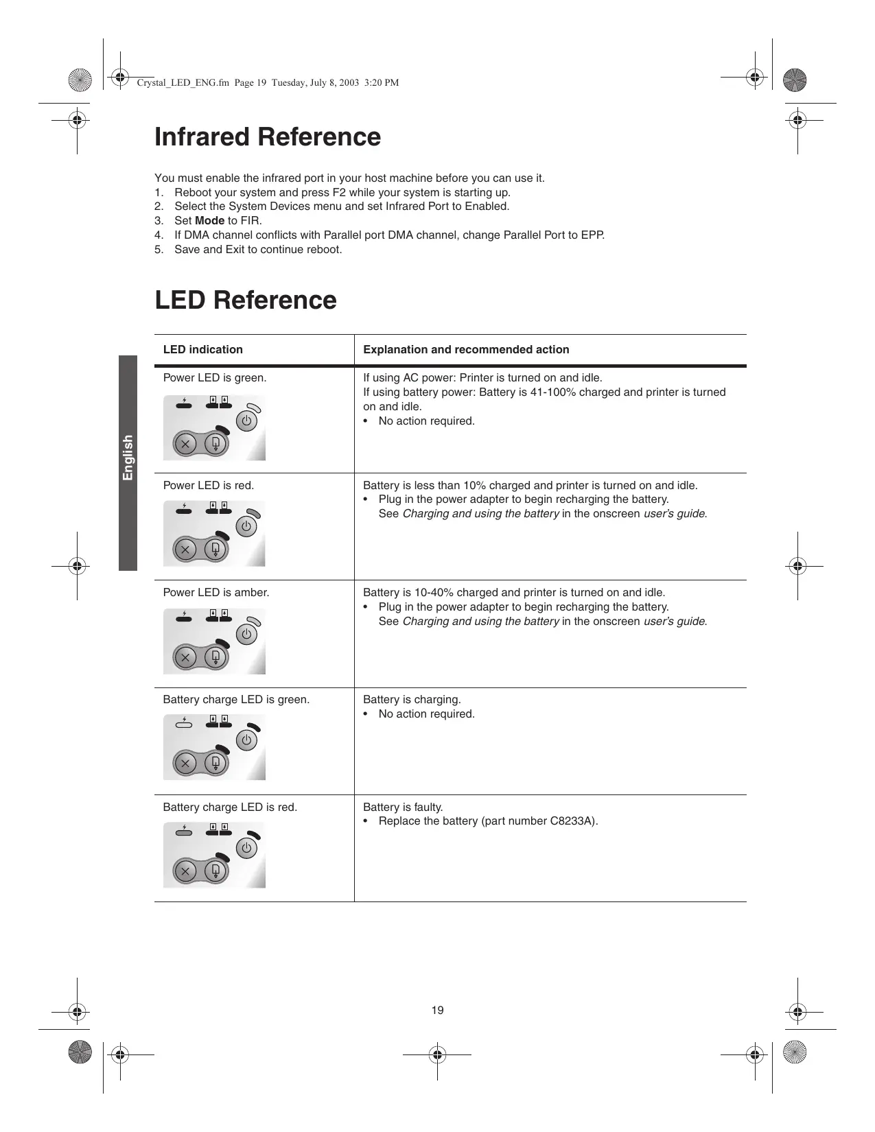 - Remove the battery if you will not be using the printer for more than a month. Crystal_LED_ENG.fm Page 19 Tuesday, July 8, 2003 3:20 PM Infrared Reference You must enable the infrared port in your host machine before you can use it.
