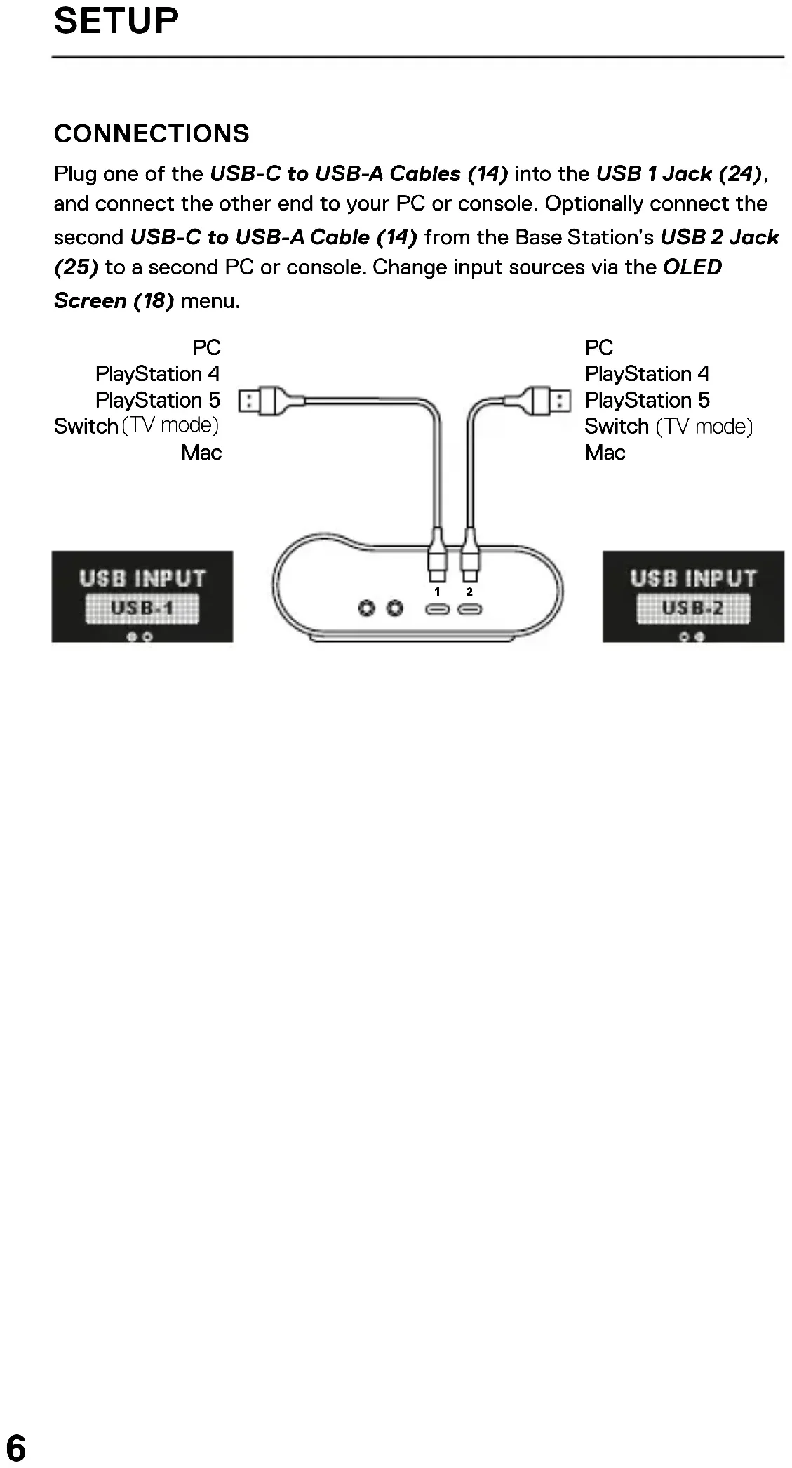*Find accessories and replacement parts at steelseries.com/gaming-accessories6 SETUP CONNECTIONS Plug one of the USB-C to USB-A Cables (14) into the USB 1 Jack (24), and connect the other end to your PC or console. Optionally connect the second USB-C to USB-A Cable (14) from the Base Station’s USB 2 Jack (25) to a second PC or console. Change input sources via the OLED Screen (18) menu.