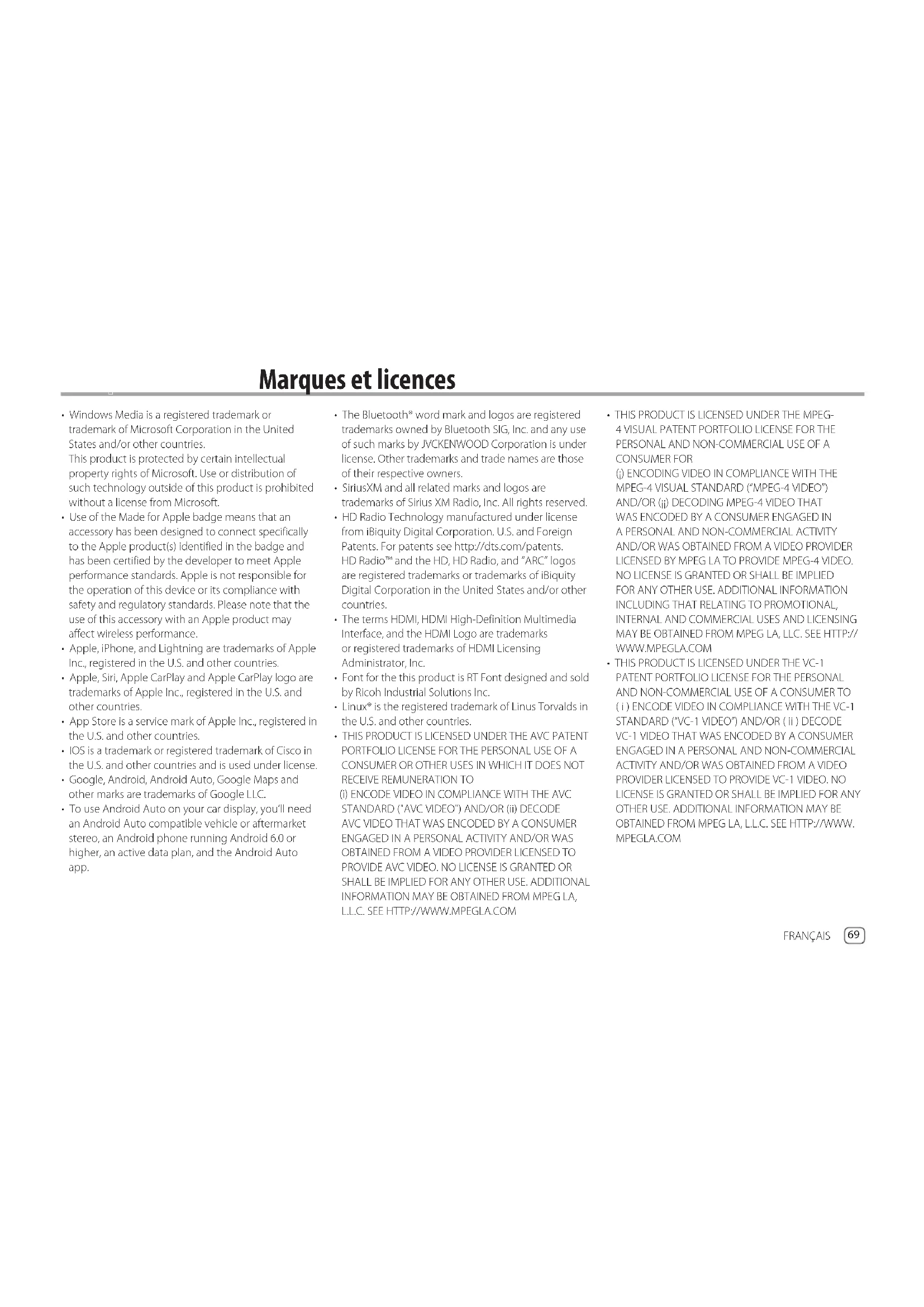 FRANÇAIS 00KWM788BH780BTFR.indb6900KWM788BH780BTFR.indb69 2022/06/2116:192022/06/2116:19Marques de commerce et licencesMarques de commerce et licences Important Notice on Software Software License on This Product The software embedded in this product comprises a number of independent software components, each of which is copyrighted by JVCKENWOOD Corporation or by a third party. This product uses software components that are based on an End-User License Agreement (hereinafter called “EULA”) stipulated by JVCKENWOOD Corporation and by third parties. The EULA dictates the availability of the source codes of free-software components as a prerequisite to distributing them in executable form under the terms of the GNU General Public License or the Lesser General Public License (hereinafter called “GPL/LGPL”). To get information about the software components that are subject to the terms of the GPL/LGPL, please visit the following Website: Website URL https://www3.jvckenwood.com/english/ download/gpl/ Queries concerning the contents of the source code or the like will not be accepted. Please note that software components based on a EULA that is not subject to the terms of the GPL/LGPL or those that have been developed or created by JVCKENWOOD Corporation will be excluded from the scope of source code disclosure. Because licenses to use software components distributed under the GPL/LGPL are offered to the customers for free of charge, no warranty is granted to the customers, whether explicitly or implicitly, to the extent of the applicable laws. Unless otherwise stipulated by the applicable laws or agreed upon in writing, the copyright holders or those who are entitled to modify and redistribute the software components are not held responsible for any and all damages resulting from their use or from inability to use them. For more information about the terms of use of the software components, required items of compliance and so on, please refer to the GPL/LGPL. Customers wishing themselves to use a software component that is subject to the GPL/LGPL embedded in this product are encouraged to read the terms of the corresponding license before use. Because each individual license is prescribed by a third party other than JVCKENWOOD Corporation, the original (English) of the license is presented. EULA Software License Agreement JVCKENWOOD Corporation (hereinafter called “Licensor”) holds either the copyright to the embedded software or the right to sublicense it. This agreement establishes the conditions under which the customer uses this “Licensed Software.” The customer shall agree to the terms of this license agreement before proceeding to use Licensed Software. This agreement is deemed to have taken effect when the customer (hereinafter called “User”) has used a product implementation of Licensed Software. The Licensed Software may contain software Licensor has been licensed to use by third parties directly or indirectly. Some third parties may have terms of use prescribed for their customers, apart from this Software License Agreement. This agreement does not apply to such software. Be sure to consult “Important Notice on Software” as presented separately. Article 1 (General) Licensor grants to User a non-exclusive, non-assignable right of use Licensed Software within the country where the User purchases the Product (hereinafter the "Country") (except for the exception provided for in Paragraph 1, Article 3). Article 2 (Right of Use)