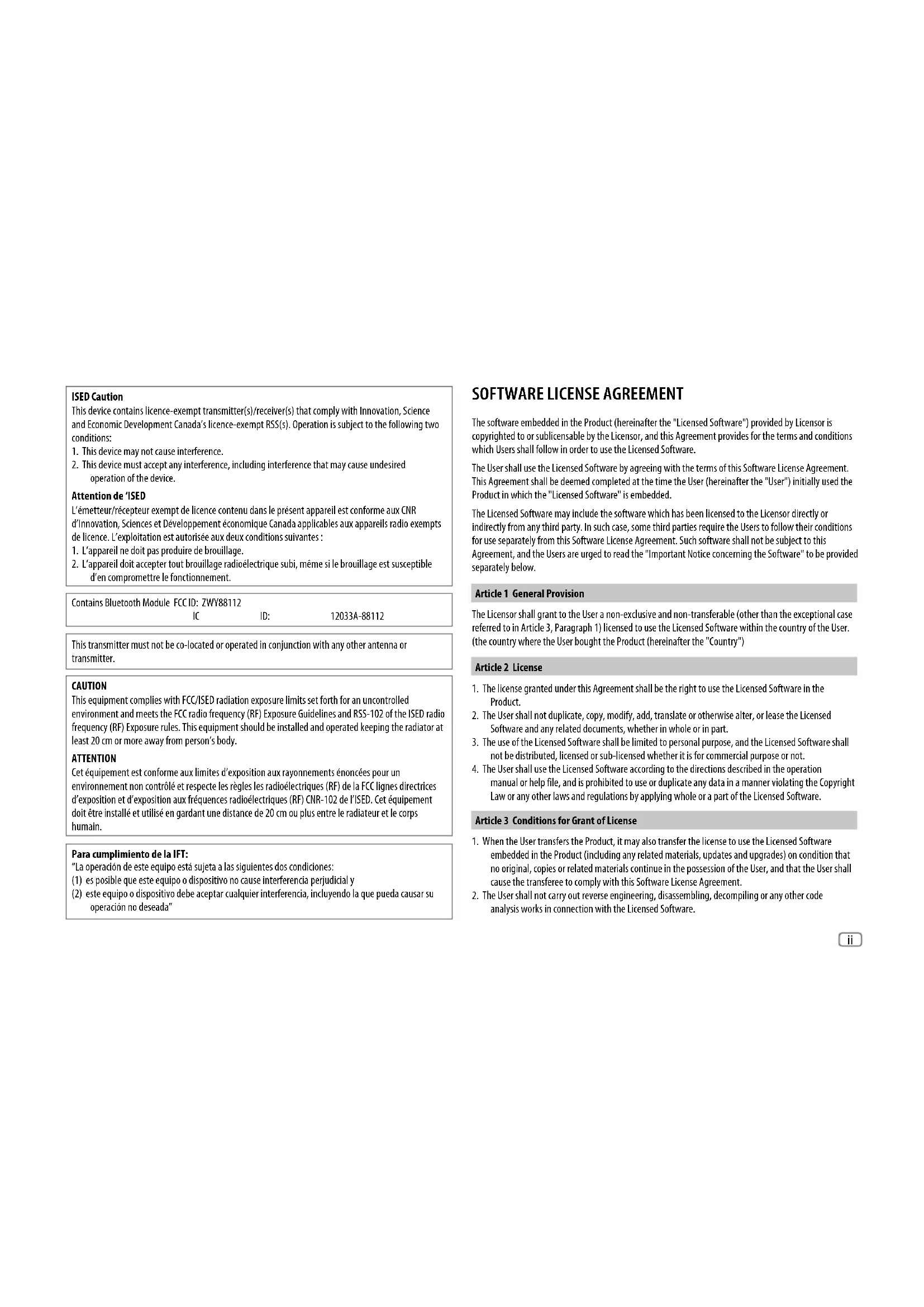 The software embedded in the Product (hereinafter the "Licensed Software") provided by Licensor is copyrighted to or sublicensable by the Licensor, and this Agreement provides for the terms and conditions which Users shall follow in order to use the Licensed Software. The User shall use the Licensed Software by agreeing with the terms of this Software License Agreement. This Agreement shall be deemed completed at the time the User (hereinafter the "User") initially used the Product in which the "Licensed Software" is embedded. The Licensed Software may include the software which has been licensed to the Licensor directly or indirectly from any third party. In such case, some third parties require the Users to follow their conditions for use separately from this Software License Agreement. Such software shall not be subject to this Agreement, and the Users are urged to read the "Important Notice concerning the Software" to be provided separately below. Article 1 General Provision The Licensor shall grant to the User a non-exclusive and non-transferable (other than the exceptional case referred to in Article 3, Paragraph 1) licensed to use the Licensed Software within the country of the User. (the country where the User bought the Product (hereinafter the "Country") Article 2 License