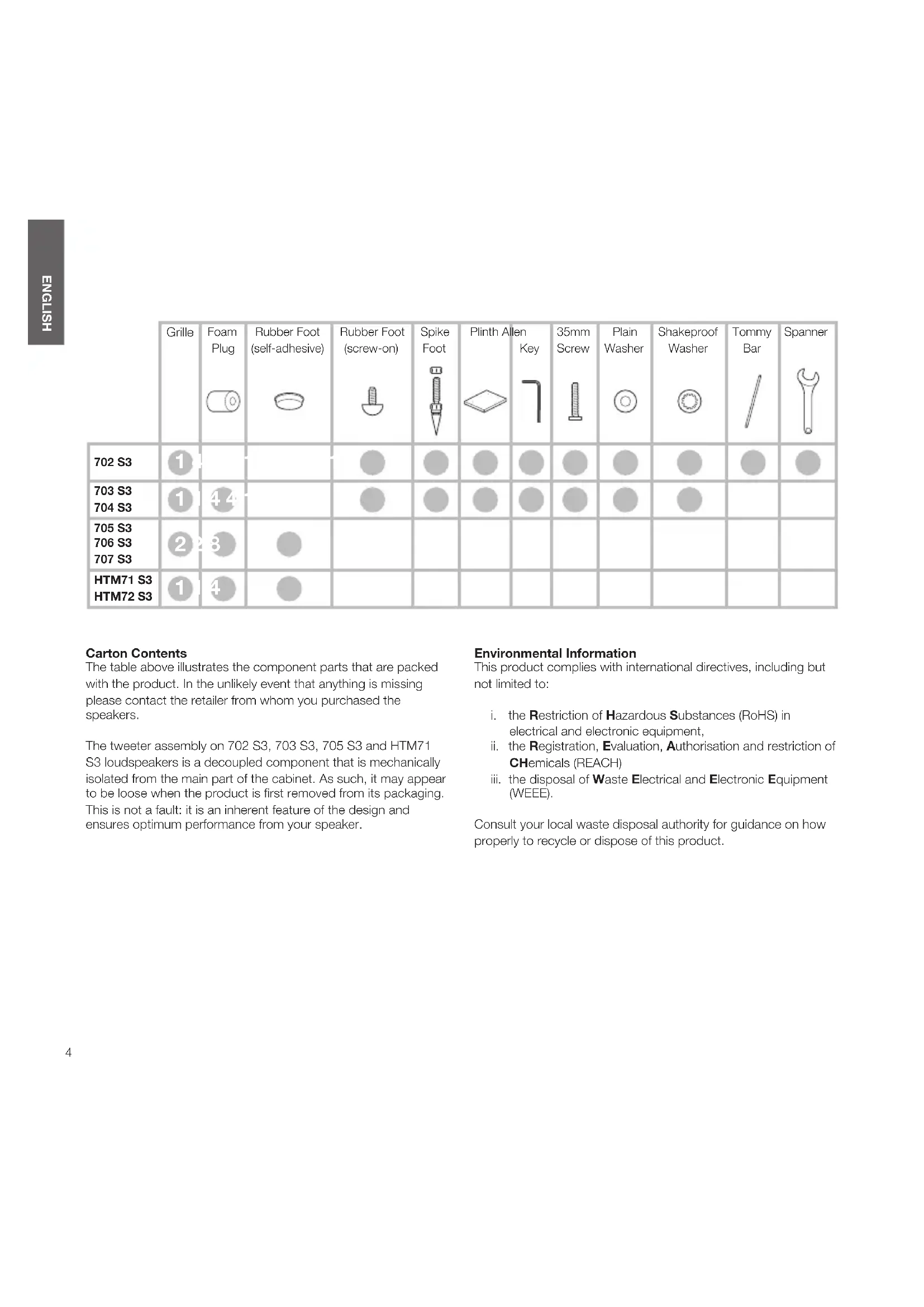 (WEEE). Consult your local waste disposal authority for guidance on how properly to recycle or dispose of this product. ENGLISH Grille Foam Plug Rubber Foot (self-adhesive) Rubber Foot (screw-on) Spike Foot Plinth Allen Key 35mm Screw Plain Washer Shakeproof Washer Tommy Bar Spanner 702 S3