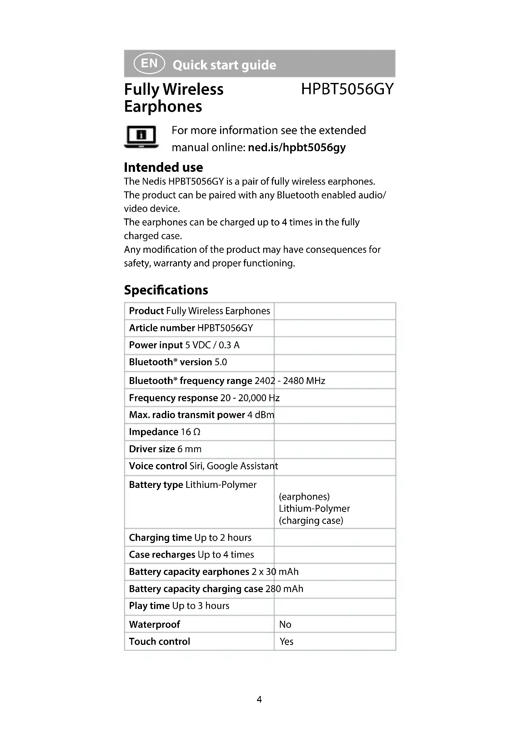 Quick start guide Fully Wireless Earphones HPBT5056GY For more information see the extended manual online: ned.is/hpbt5056gy Intended use The Nedis HPBT5056GY is a pair of fully wireless earphones. The product can be paired with any Bluetooth enabled audio/ video device. The earphones can be charged up to 4 times in the fully charged case. Any modication of the product may have consequences for safety, warranty and proper functioning. Specications Product Fully Wireless Earphones Article number HPBT5056GY Power input 5 VDC / 0.3 A Bluetooth® version 5.0 Bluetooth® frequency range 2402 - 2480 MHz Frequency response 20 - 20,000 Hz Max. radio transmit power 4 dBm Impedance 16 Ω Driver size 6 mm Voice control Siri, Google Assistant Battery type Lithium-Polymer (earphones) Lithium-Polymer (charging case) Charging time Up to 2 hours Case recharges Up to 4 times Battery capacity earphones 2 x 30 mAh Battery capacity charging case 280 mAh Play time Up to 3 hours Waterproof No Touch control Yes5 Main parts (image A)
