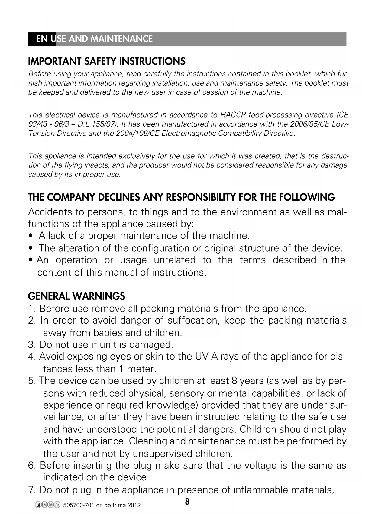 Before using your appliance, read carefully the instructions contained in this booklet, which fur- nish important information regarding installation, use and maintenance safety. The booklet must be keeped and delivered to the new user in case of cession of the machine. This electrical device is manufactured in accordance to HACCP food-processing directive (CE 93/43 - 96/3 – D.L.155/97). It has been manufactured in accordance with the 2006/95/CE Low- Tension Directive and the 2004/108/CE Electromagnetic Compatibility Directive. This appliance is intended exclusively for the use for which it was created, that is the destruc- tion of the flying insects, and the producer would not be considered responsible for any damage caused by its improper use. THE COMPANY DECLINES ANY RESPONSIBILITY FOR THE FOLLOWING Accidents to persons, to things and to the environment as well as mal- functions of the appliance caused by: