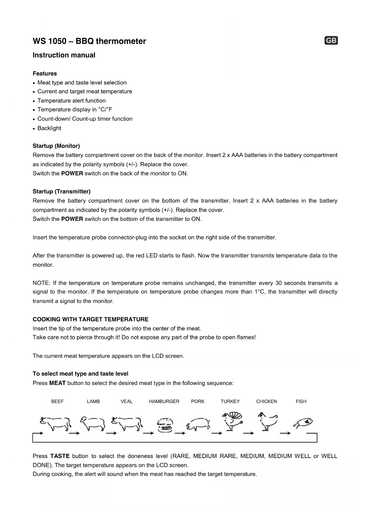 Press TASTE button to select the doneness level (RARE, MEDIUM RARE, MEDIUM, MEDIUM WELL or WELL DONE). The target temperature appears on the LCD screen. During cooking, the alert will sound when the meat has reached the target temperature.MEAT BEEF LAMP VEAL HAMBURGER PORK TURKEY CHICKEN FISH SYMBOL