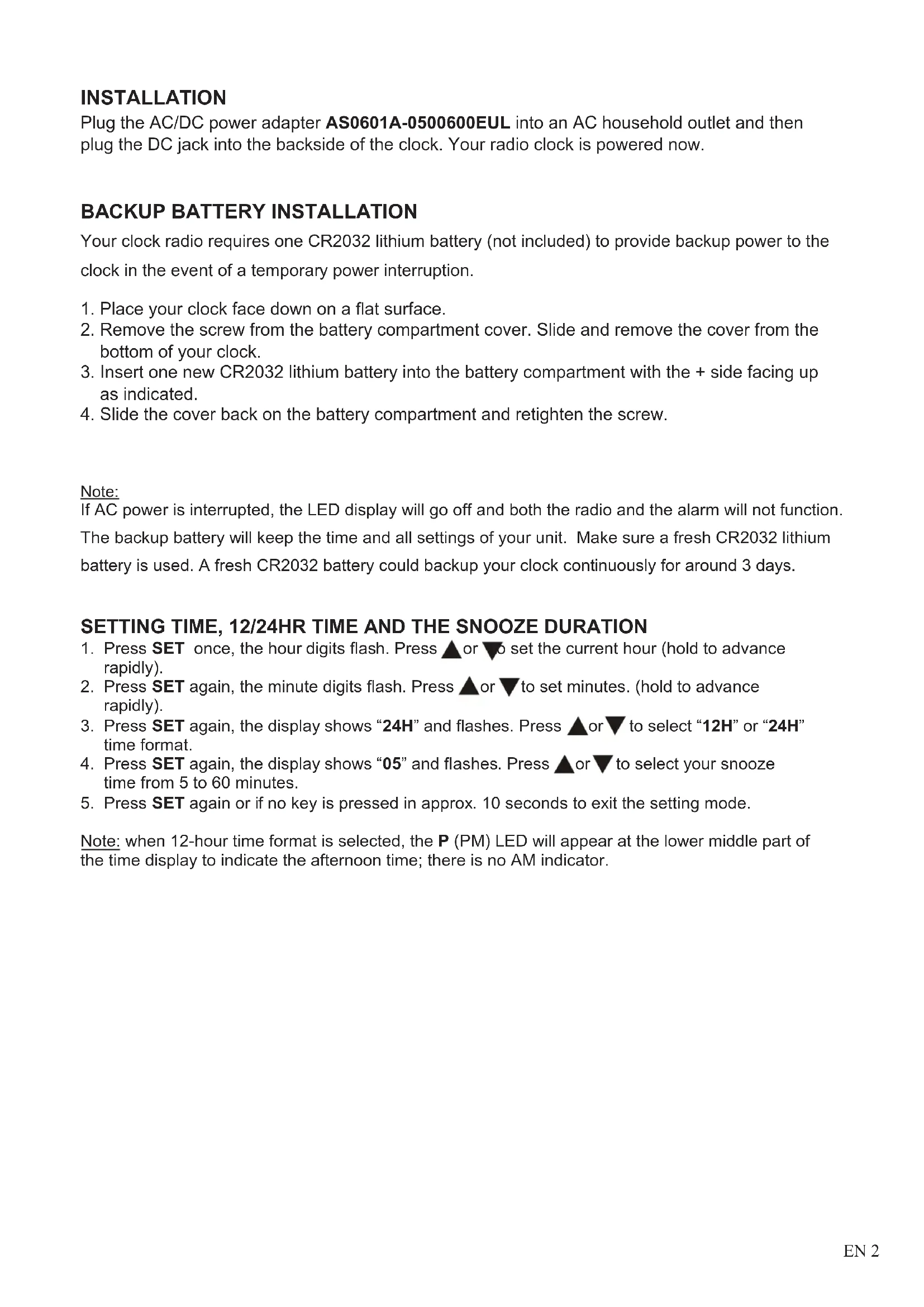 If AC power is interrupted, the LED display will go off and both the radio and the alarm will not function. The backup battery will keep the time and all settings of your unit. Make sure a fresh CR2032 lithium battery is used. A fresh CR2032 battery could backup your clock continuously for around 3 days. SETTING TIME, 12/24HR TIME AND THE SNOOZE DURATION