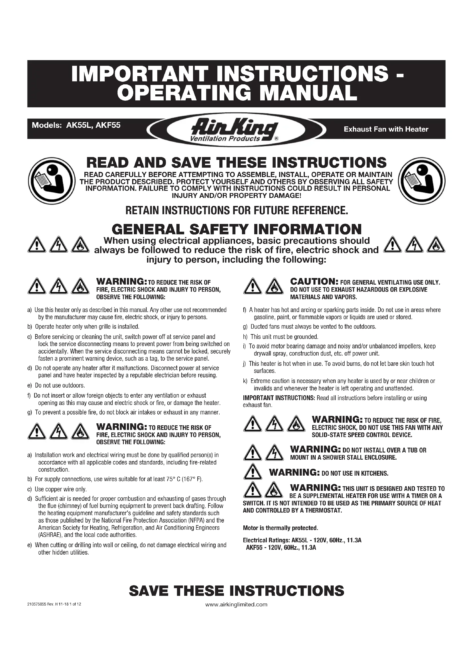www.airkinglimited.com210575055 Rev. H 11-18 1 of 12Exhaust Fan with Heater Models: AK55L, AKF55