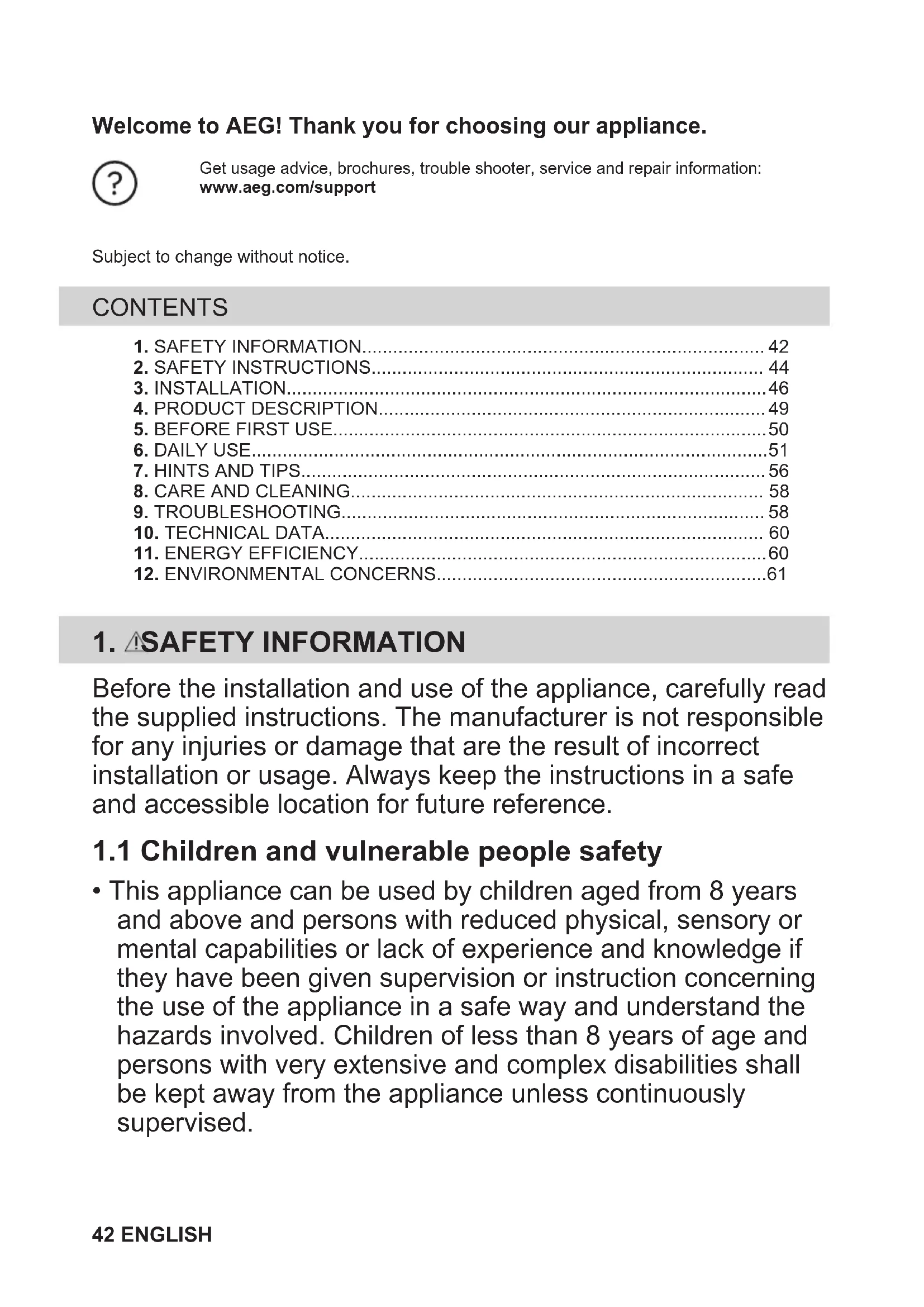 - This appliance can be used by children aged from 8 years and above and persons with reduced physical, sensory or mental capabilities or lack of experience and knowledge if they have been given supervision or instruction concerning the use of the appliance in a safe way and understand the hazards involved. Children of less than 8 years of age and persons with very extensive and complex disabilities shall be kept away from the appliance unless continuously supervised. 42 ENGLISH• Children should be supervised to ensure that they do not play with the appliance.