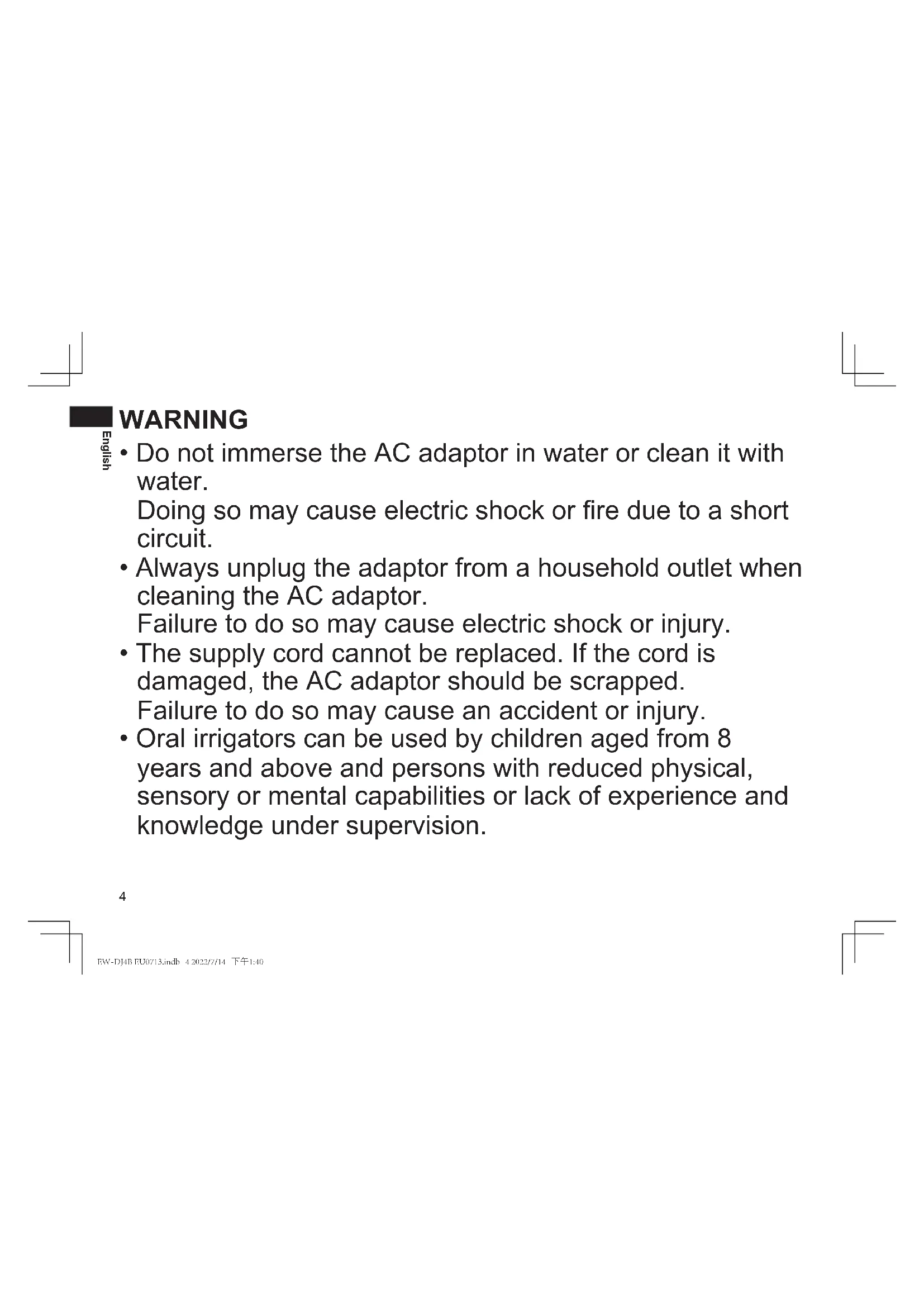 EW-DJ4B EU0713.indb 6 2022/7/14 下午1:40English WARNING Alwaysensuretheapplianceisoperated on an electric power source matched to the ratedvoltageindicatedontheACadaptor. Fullyinserttheadaptor.