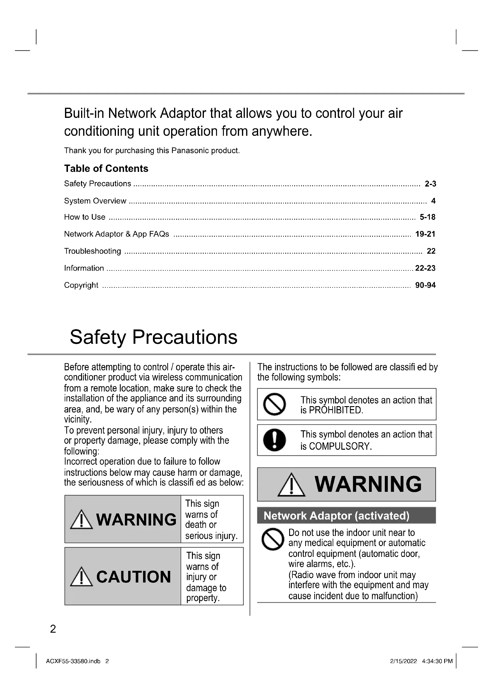 - -23 Copyright -94 Thank you for purchasing this Panasonic product. Safety Precautions Before attempting to control / operate this air-conditioner product via wireless communication from a remote location, make sure to check the installation of the appliance and its surrounding area, and, be wary of any person(s) within the vicinity.To prevent personal injury, injury to others or property damage, please comply with the following: Incorrect operation due to failure to follow instructions below may cause harm or damage, the seriousness of which is classifi ed as below: WARNING This sign warns of death or serious injury. CAUTION This sign warns of injury or damage to property.The instructions to be followed are classifi ed by the following symbols:This symbol denotes an action that is PROHIBITED.This symbol denotes an action that is COMPULSORY. WARNING Network Adaptor (activated) Do not use the indoor unit near to any medical equipment or automatic control equipment (automatic door, wire alarms, etc.).(Radio wave from indoor unit may interfere with the equipment and may cause incident due to malfunction) ACXF55-33580.indb 2ACXF55-33580.indb 2 2/15/2022 4:34:30 PM2/15/2022 4:34:30 PM3 English Safety Precautions Keep at least 15 cm away from the indoor unit if you have a cardiac pacemaker. (Radio wave from indoor unit may interfere with the operation of pacemaker) CAUTION Network Adaptor (activated) Check the following requirements in advanced (At home): p. 90