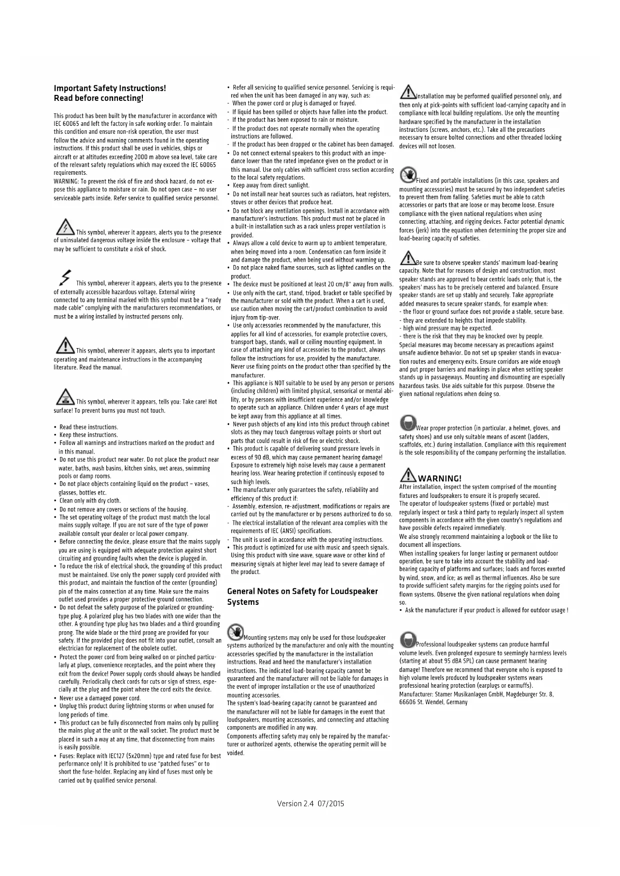 - This product is optimized for use with music and speech signals. Using this product with sine wave, square wave or other kind of measuring signals at higher level may lead to severe damage of the product. General Notes on Safety for Loudspeaker Systems Mounting systems may only be used for those loudspeaker systems authorized by the manufacturer and only with the mounting accessories specified by the manufacturer in the installation instructions. Read and heed the manufacturer’s installation instructions. The indicated load-bearing capacity cannot be guaranteed and the manufacturer will not be liable for damages in the event of improper installation or the use of unauthorized mounting accessories. The system’s load-bearing capacity cannot be guaranteed and the manufacturer will not be liable for damages in the event that loudspeakers, mounting accessories, and connecting and attaching components are modified in any way. Components affecting safety may only be repaired by the manufac- turer or authorized agents, otherwise the operating permit will be voided. Installation may be performed qualified personnel only, and then only at pick-points with sufficient load-carrying capacity and in compliance with local building regulations. Use only the mounting hardware specified by the manufacturer in the installation instructions (screws, anchors, etc.). Take all the precautions necessary to ensure bolted connections and other threaded locking devices will not loosen. Fixed and portable installations (in this case, speakers and mounting accessories) must be secured by two independent safeties to prevent them from falling. Safeties must be able to catch accessories or parts that are loose or may become loose. Ensure compliance with the given national regulations when using connecting, attaching, and rigging devices. Factor potential dynamic forces (jerk) into the equation when determining the proper size and load-bearing capacity of safeties. Be sure to observe speaker stands’ maximum load-bearing capacity. Note that for reasons of design and construction, most speaker stands are approved to bear centric loads only; that is, the speakers’ mass has to be precisely centered and balanced. Ensure speaker stands are set up stably and securely. Take appropriate added measures to secure speaker stands, for example when: - the floor or ground surface does not provide a stable, secure base. - they are extended to heights that impede stability. - high wind pressure may be expected. - there is the risk that they may be knocked over by people. Special measures may become necessary as precautions against unsafe audience behavior. Do not set up speaker stands in evacua- tion routes and emergency exits. Ensure corridors are wide enough and put proper barriers and markings in place when setting speaker stands up in passageways. Mounting and dismounting are especially hazardous tasks. Use aids suitable for this purpose. Observe the given national regulations when doing so. Wear proper protection (in particular, a helmet, gloves, and safety shoes) and use only suitable means of ascent (ladders, scaffolds, etc.) during installation. Compliance with this requirement is the sole responsibility of the company performing the installation. WARNING! After installation, inspect the system comprised of the mounting fixtures and loudspeakers to ensure it is properly secured. The operator of loudspeaker systems (fixed or portable) must regularly inspect or task a third party to regularly inspect all system components in accordance with the given country’s regulations and have possible defects repaired immediately. We also strongly recommend maintaining a logbook or the like to document all inspections. When installing speakers for longer lasting or permanent outdoor operation, be sure to take into account the stability and load- bearing capacity of platforms and surfaces; loads and forces exerted by wind, snow, and ice; as well as thermal influences. Also be sure to provide sufficient safety margins for the rigging points used for flown systems. Observe the given national regulations when doing so.