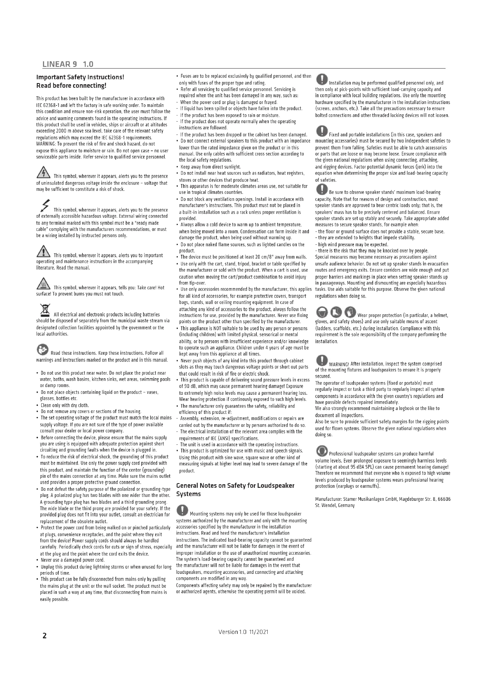 Professional loudspeaker systems can produce harmful volume levels. Even prolonged exposure to seemingly harmless levels (starting at about 95 dBA SPL) can cause permanent hearing damage! Therefore we recommend that everyone who is exposed to high volume levels produced by loudspeaker systems wears professional hearing protection (earplugs or earmuffs).