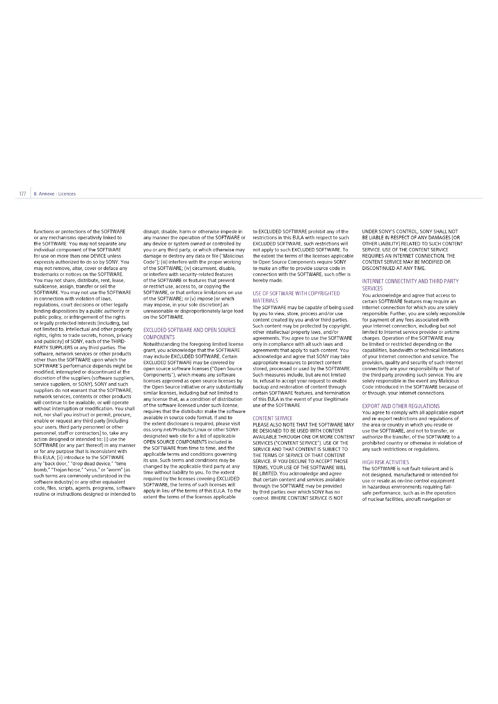 functions or protections of the SOFTWARE or any mechanisms operatively linked to the SOFTWARE. You may not separate any individual component of the SOFTWARE for use on more than one DEVICE unless expressly authorized to do so by SONY. You may not remove, alter, cover or deface any trademarks or notices on the SOFTWARE. You may not share, distribute, rent, lease, sublicense, assign, transfer or sell the SOFTWARE. You may not use the SOFTWARE in connection with violation of laws, regulations, court decisions or other legally binding dispositions by a public authority or public policy, or infringement of the rights or legally protected interests (including, but not limited to, intellectual and other property rights, rights to trade secrets, honors, privacy and publicity) of SONY, each of the THIRD- PARTY SUPPLIERS or any third parties. The software, network services or other products other than the SOFTWARE upon which the SOFTWARE’S performance depends might be modified, interrupted or discontinued at the discretion of the suppliers (software suppliers, service suppliers, or SONY). SONY and such suppliers do not warrant that the SOFTWARE, network services, contents or other products will continue to be available, or will operate without interruption or modification. You shall not, nor shall you instruct or permit, procure, enable or request any third party (including your users, third party personnel or other personnel, staff or contractors) to, take any action designed or intended to: (i) use the SOFTWARE (or any part thereof) in any manner or for any purpose that is inconsistent with this EULA; (ii) introduce to the SOFTWARE any “back door,” “drop dead device,” “time bomb,” “Trojan horse,” “virus,” or “worm” (as such terms are commonly understood in the software industry) or any other equivalent code, files, scripts, agents, programs, software routine or instructions designed or intended to disrupt, disable, harm or otherwise impede in any manner the operation of the SOFTWARE or any device or system owned or controlled by you or any third party, or which otherwise may damage or destroy any data or file (“Malicious Code”); (iii) interfere with the proper working of the SOFTWARE; (iv) circumvent, disable, or interfere with security-related features of the SOFTWARE or features that prevent or restrict use, access to, or copying the SOFTWARE, or that enforce limitations on use of the SOFTWARE; or (v) impose (or which may impose, in your sole discretion) an unreasonable or disproportionately large load on the SOFTWARE.